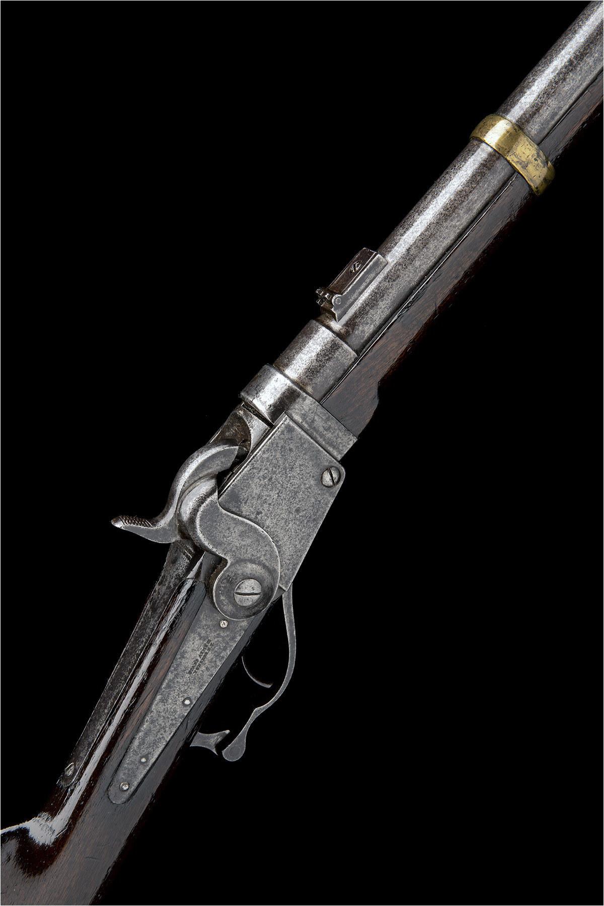 circa 1862, with round tapering 21in. barrel signed 'STARR ARMS CO, YONKERS N.Y.', dove-tailed blade fore-sight, folding notch and 'battle' sight, square receiver with falling-block mechanism and saddle-ring mounted to left hand side, the top of top tang marked 'STARR'S PATENT SEPT. 14TH 1858', the back-action lockplate signed 'STARR ARMS CO, YONKERS N.Y.', large slab-sided hammer, walnut straight-hand butt-stock and splinter fore-end, brass heel-plate and barrel-band and iron underlever forming the trigger-guard