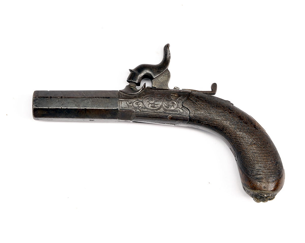 A 40-BORE PERCUSSION POCKET-PISTOL SIGNED WILLIAMS & POWELL, LIVERPOOL, no visible serial number, circa 1840, with turn-off 2in. octagonal barrel, radiused and engraved central hammer action with concealed automatic trigger and chequered walnut bag-shaped butt with lion mask butt-cap