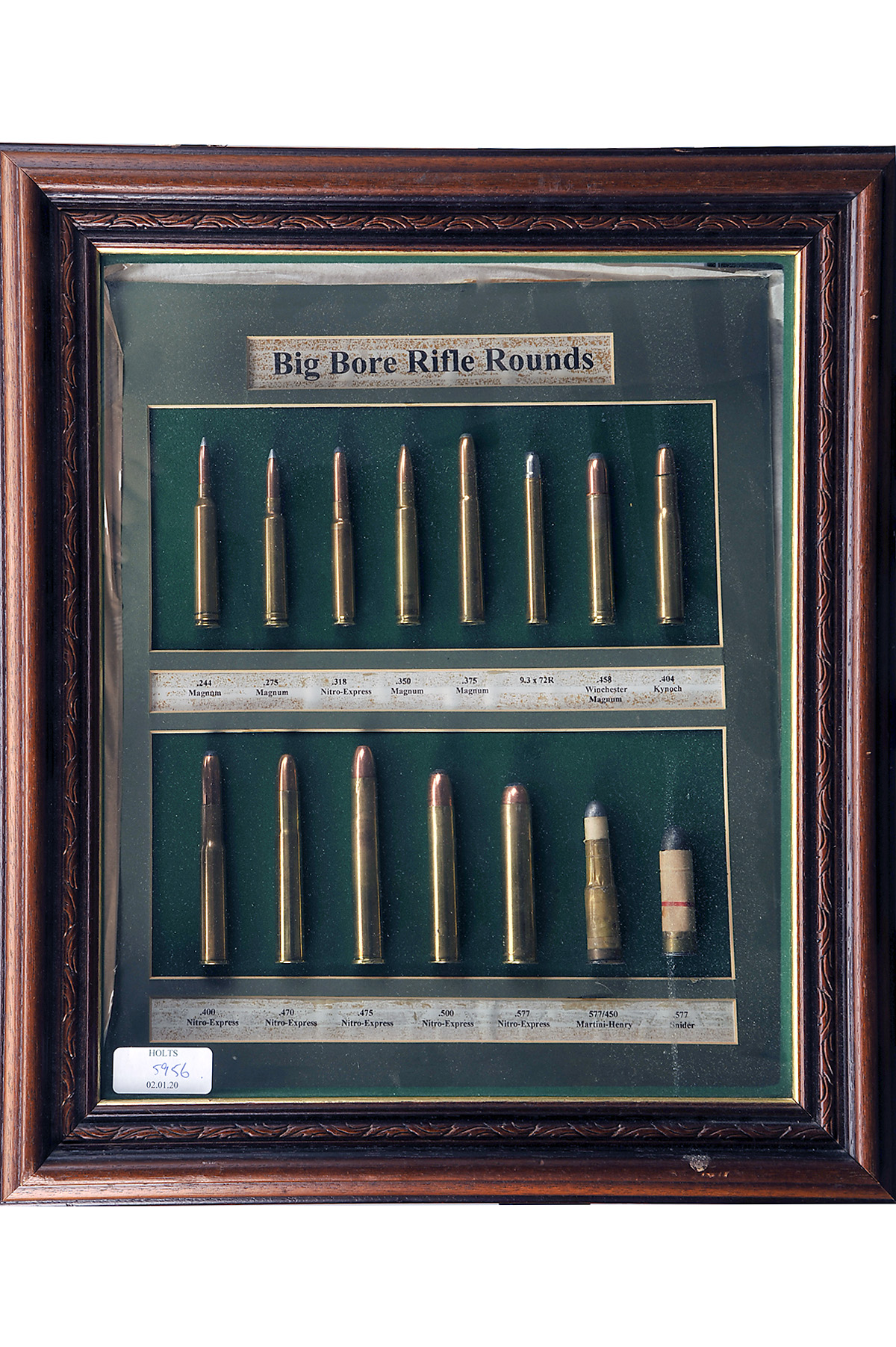A GLAZED FRAMED COLLECTION OF MOUNTED BIG-BORE BRASS CARTRIDGES, titled 'BIG BORE RIFLE ROUNDS' showing a collection of soft-point big bore rifle ammunition comprising of .244 mag, .275 mag, .318 nitro express, .350 mag, .375 mag, 9.3x72R, .458 win. mag, .404 kynoch, .400 nitro express, .470 nitro express, .475 nitro express, .500 nitro express, .577 nitro express, .577/450 martini-henry, .577 snider, all mounted on green baize and illustrated below