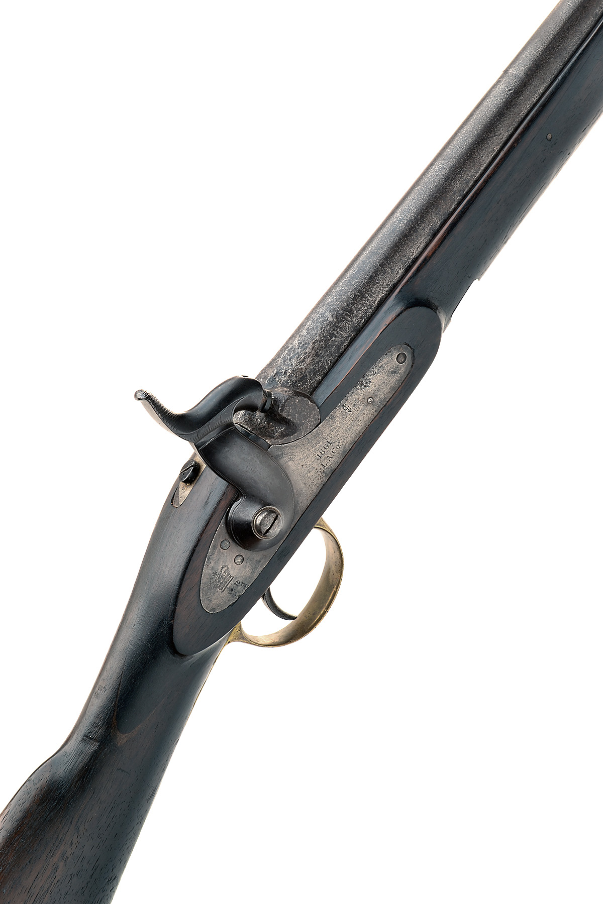 A .577 PERCUSSION MUSKET SIGNED LAC. CO, MODEL 'PATTERN 56 TWO-BAND', no visible serial number, dated for 1861 and smoothbored for the sporting market, with 31 1/2in. barrel (sights and bayonet lug removed), signed lock, walnut three-quarter stock and brass furniture