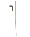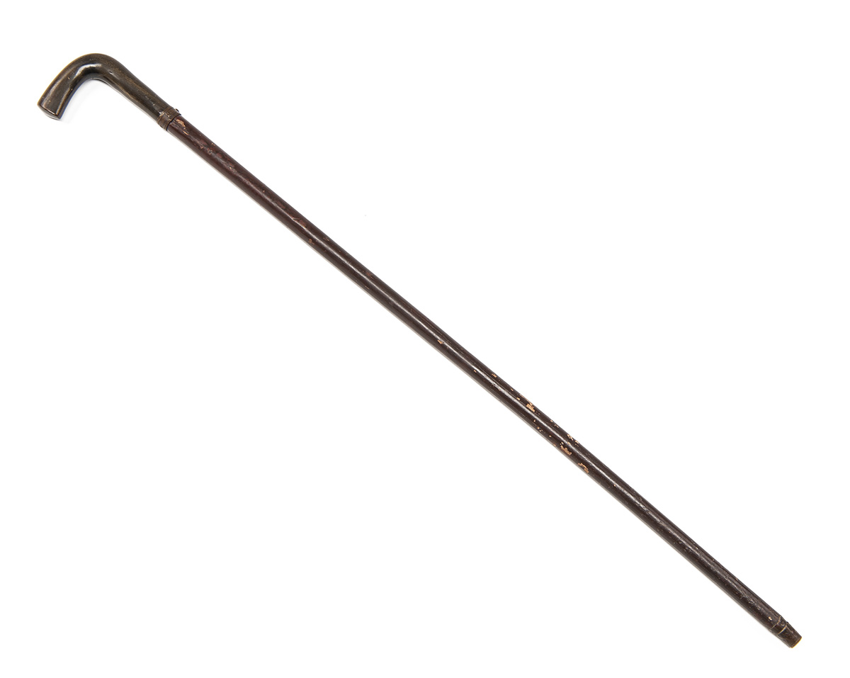 circa 1850, with diamond cross-section 17 1/2in. blued blade, both sides with a panel of gilt arabesques, plain malacca shaft with moulded studded collar, one stud concealing the locking button and crooked horn handle, 34 3/4in. overall