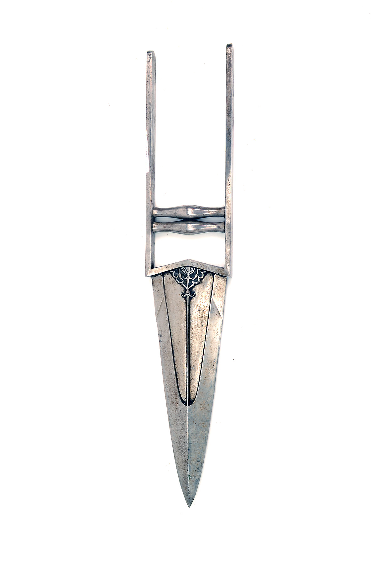 AN INDIAN KATAR DAGGER, circa 1840, with 9 3/4in. triangular blade with thickened point, carved out central section with medial ridge and arabesques at forte, twin grip 'rugby post' grip and plain side-arms, no scabbard