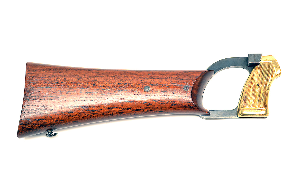 A REPRODUCTION WOODEN SHOULDER-STOCK FOR A WEBLEY MKVI REVOLVER OR LINE-LAUNCHER, serial no. 59254, approximately 15in. overall with blued bracket forming a slab-sided grip on one side with a chequered brass grip on reverse, to replace the existing weapon grips
