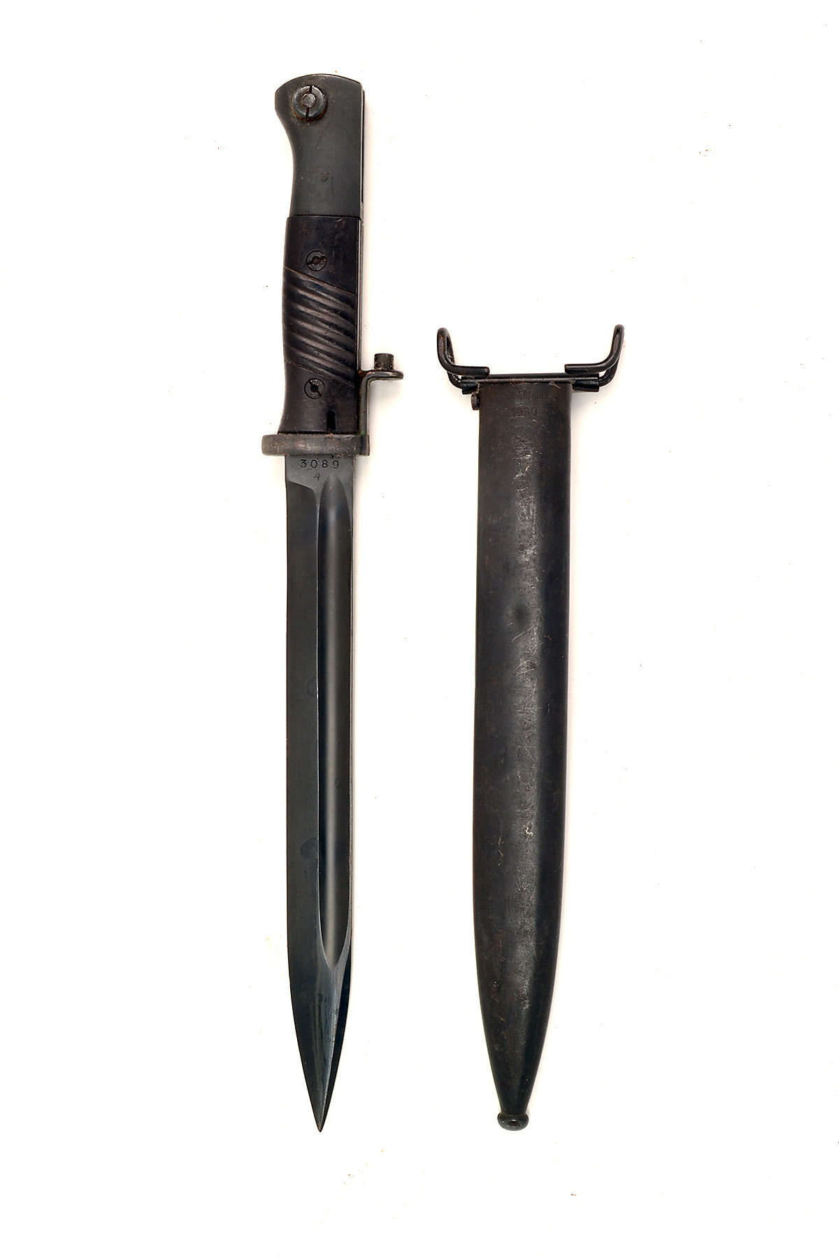 A BAYONET FOR THE NORWEGIAN ISSUE M1 GARAND, converted form a Mauser K98K bayonet with ribbed bakelite grips and complete with correct scabbard adapted for the US belt