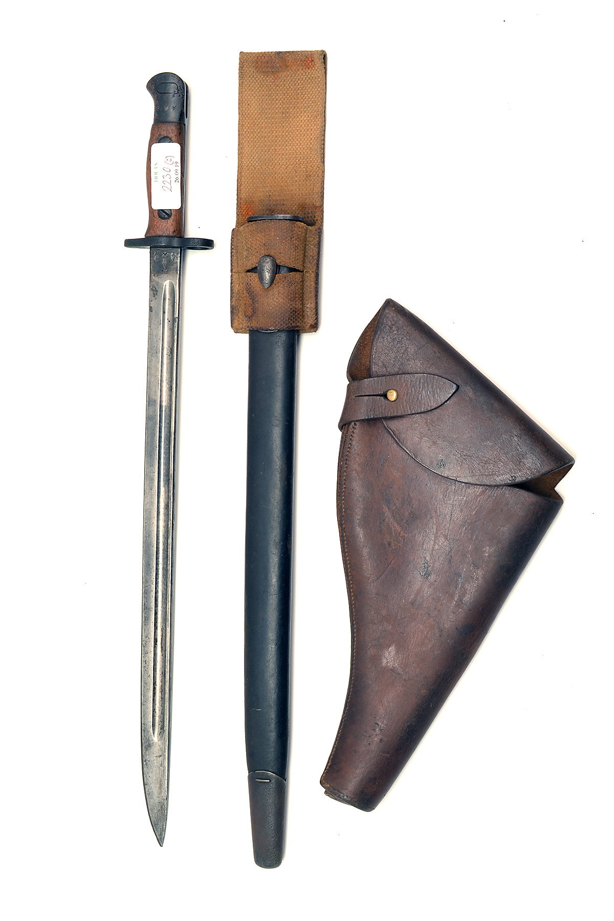 A BRITISH PATTERN '07 BAYONET AND A LEATHER SERVICE-HOLSTER, the first in 1922 Pattern frog (possibly Lanchester machine gun), the second for a Webley MKVI or similar and dated 1916 (stitching coming undone)