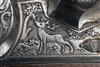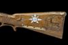 circa 1740, with 28 1/2in. re-blued swamped octagonal sighted barrel rifled with seven grooves and inlaid with silver scrollwork at the muzzle and breech, silver-inlaid signature 'ANDREAS AUER IN LAUFFEN' and silver-lined maker's marks at the breech, silver bead fore-sight, engraved tang, flat bevelled lock chiselled in low relief with a hound and a stag, walnut full stock carved in relief with foliage, scrollwork, a stag and a recumbent doe, chequered grip, raised cheek-piece, the latter with inlaid mother of pearl sunburst (one segment missing), the stock embellished with shaped brass plaques, sliding wooden brass mounted patch-box cover, double-set triggers, moulded wooden trigger-guard, shaped brass mounts, brass sling mount and replacement ramrod.