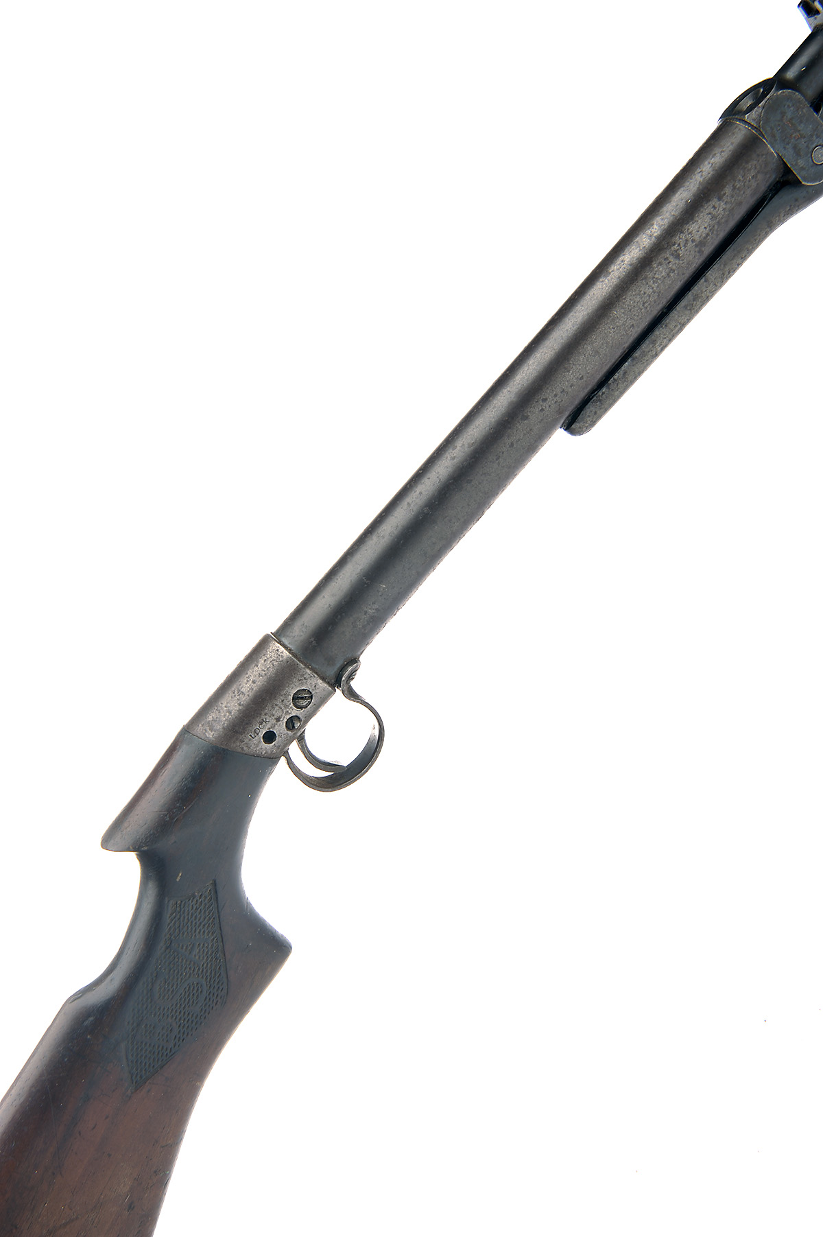 A SCARCE .22 UNDER-LEVER AIR-RIFLE SIGNED BSA, MODEL ''T' PREFIX STANDARD', serial no. T3851, for 1937, with sighted 19 1/4in. barrel, tap-action breech, plain air-chamber (no etching visible) and walnut saw-handled butt-stock with push-button under-lever