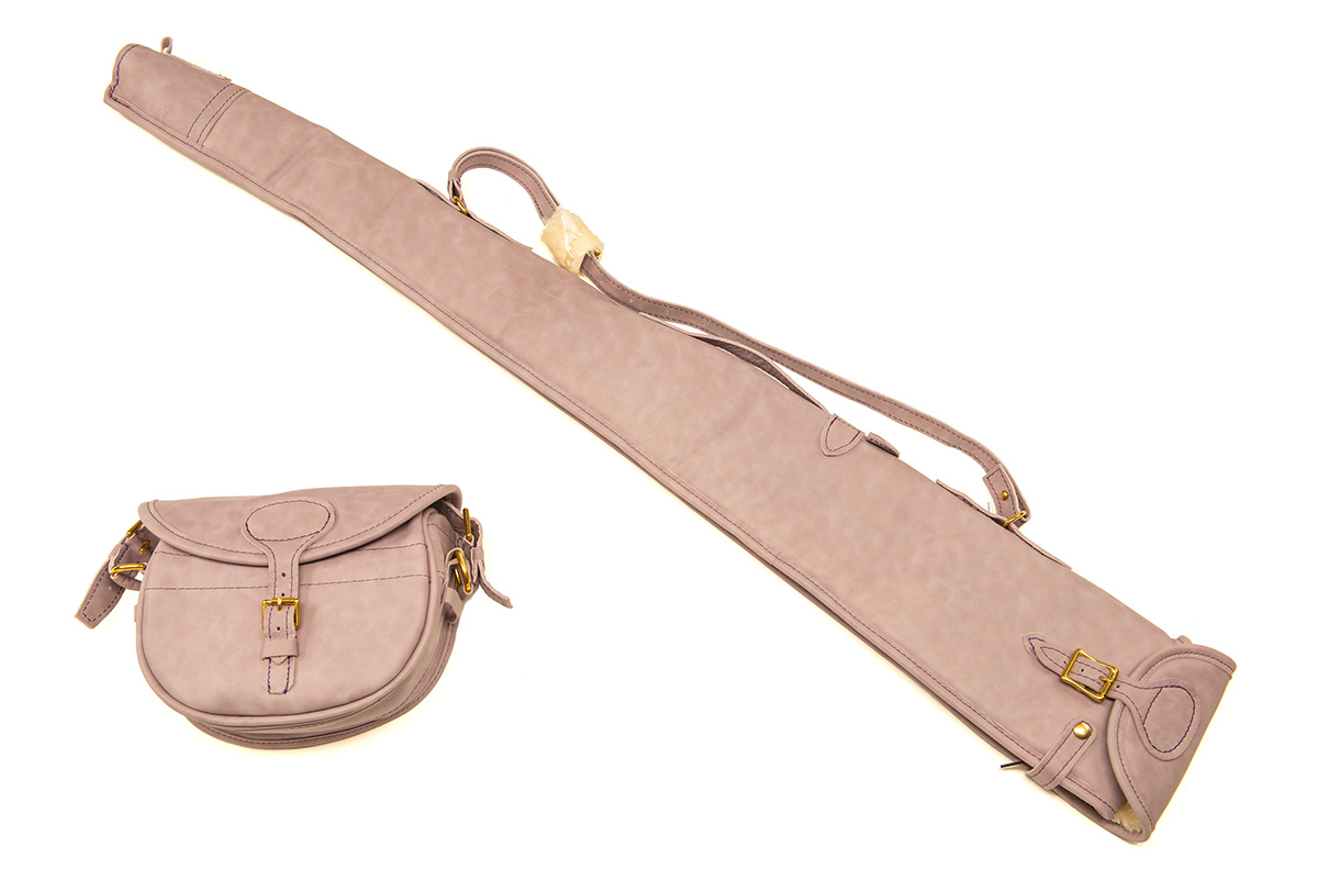AN UNUSED LILAC LEATHER SHEEPSKIN-LINED SINGLE GUNSLIP WITH MATCHING CARTRIDGE BAG,