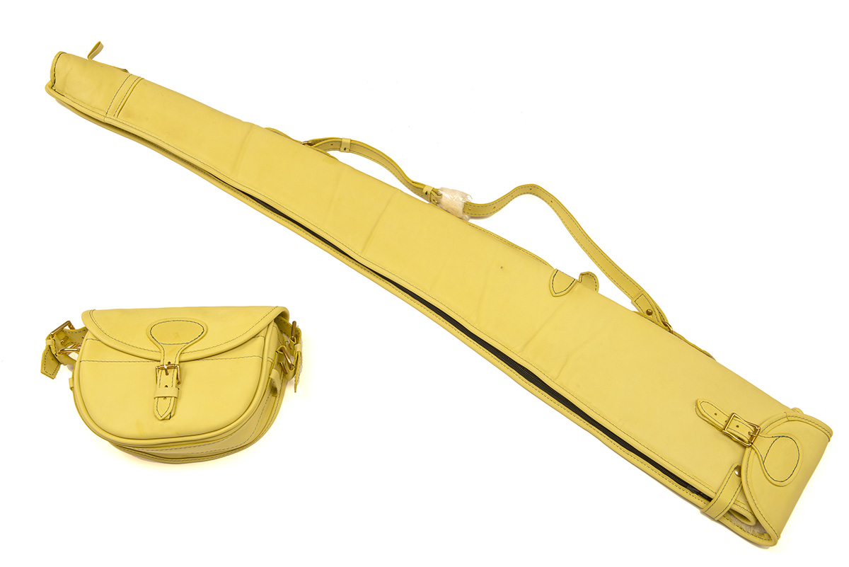 AN UNUSED LIME LEATHER SHEEPSKIN-LINED SINGLE GUNSLIP WITH MATCHING CARTRIDGE BAG,