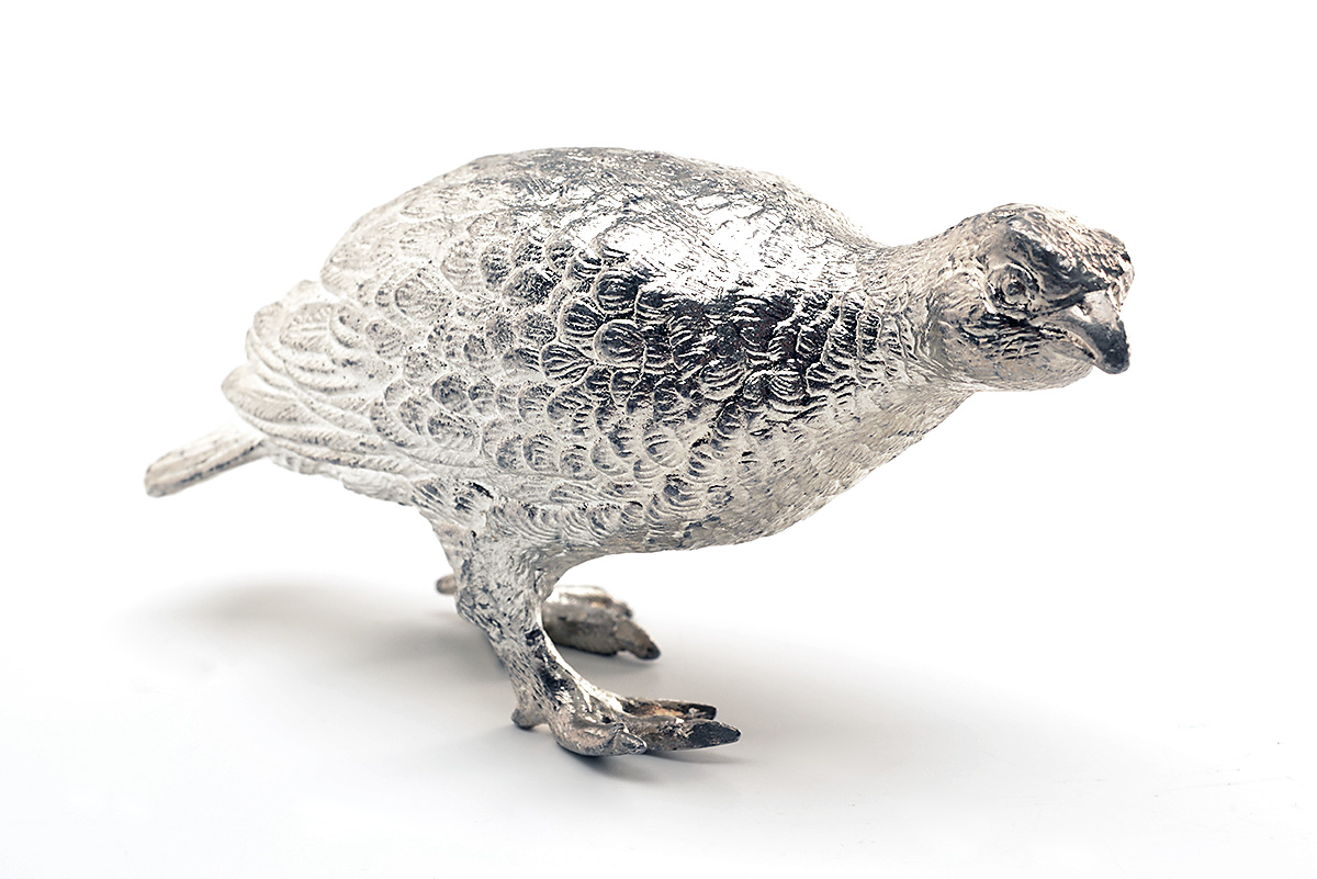 A SILVER-PLATED FULL MOUNT OF A GROUSE, measuring approx. 3in. x 1 5/8in.