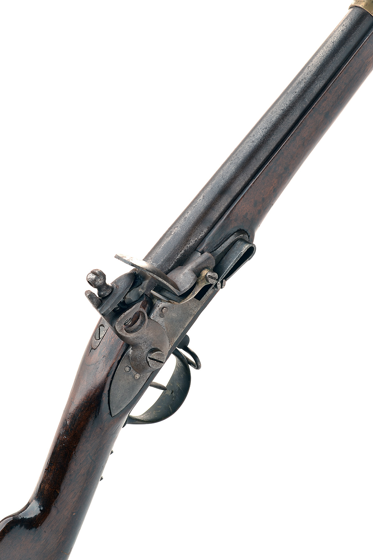 A .730 FLINTLOCK SERVICE-MUSKET, SIGNATURE OBSCURED, mode '1822 CHARLEVILLE TYPE', no visible serial number, with 36 1/2in. rifled barrel, sights integral with the barrel-bands, Liege proofs, military style lock with traces of signature and walnut full-stock with brass and iron furniture