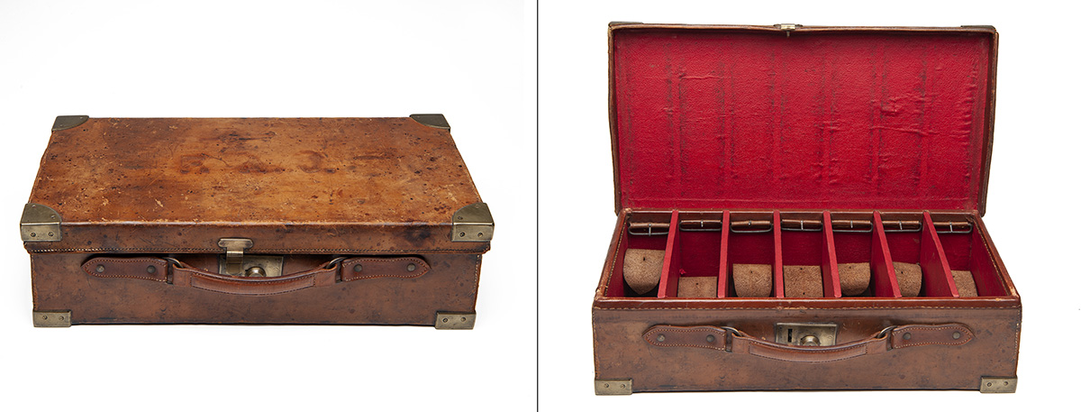 for approx. 500 cartridges, the interior lined with red canvas, six removable dividers, seven leather lifters, brass lock (key missing)