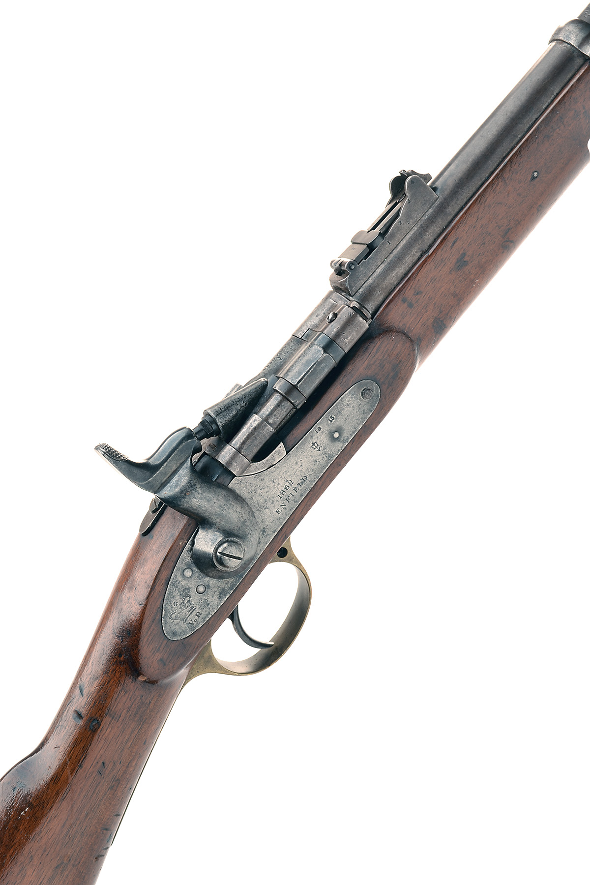 A .577 (SNIDER) SINGLE-SHOT CARBINE SIGNED ENFIELD, MODEL 'SNIDER CARBINE', serial no. 53, dated for 1862, with round 19 1/2in. barrel, flip-open breech marked 'BSA Co', signed and dated lock and walnut half-stock modified from full with single iron barrel-band