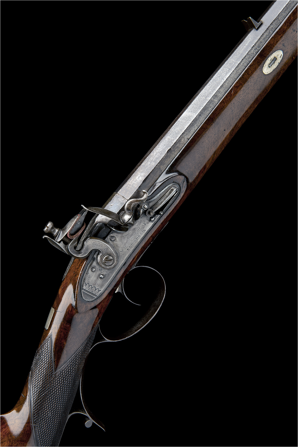circa 1800, with octagonal smoothbore 32in. barrel, dove-tailed blade fore-sight, standing notch rear-sight, platinum lined touch-hole at breech, borderline engraved top-tang, flat bevel-edged lock with stepped tail and signed below the rainproof pan 'W. MACLAUGHLAN, EDINBURGH' (rubbed), figured walnut half-stock with iron furniture including raised pistol-grip spur to the lower tang, single barrel key and brass tipped mahogany ramrod