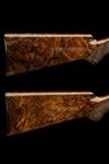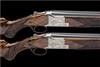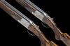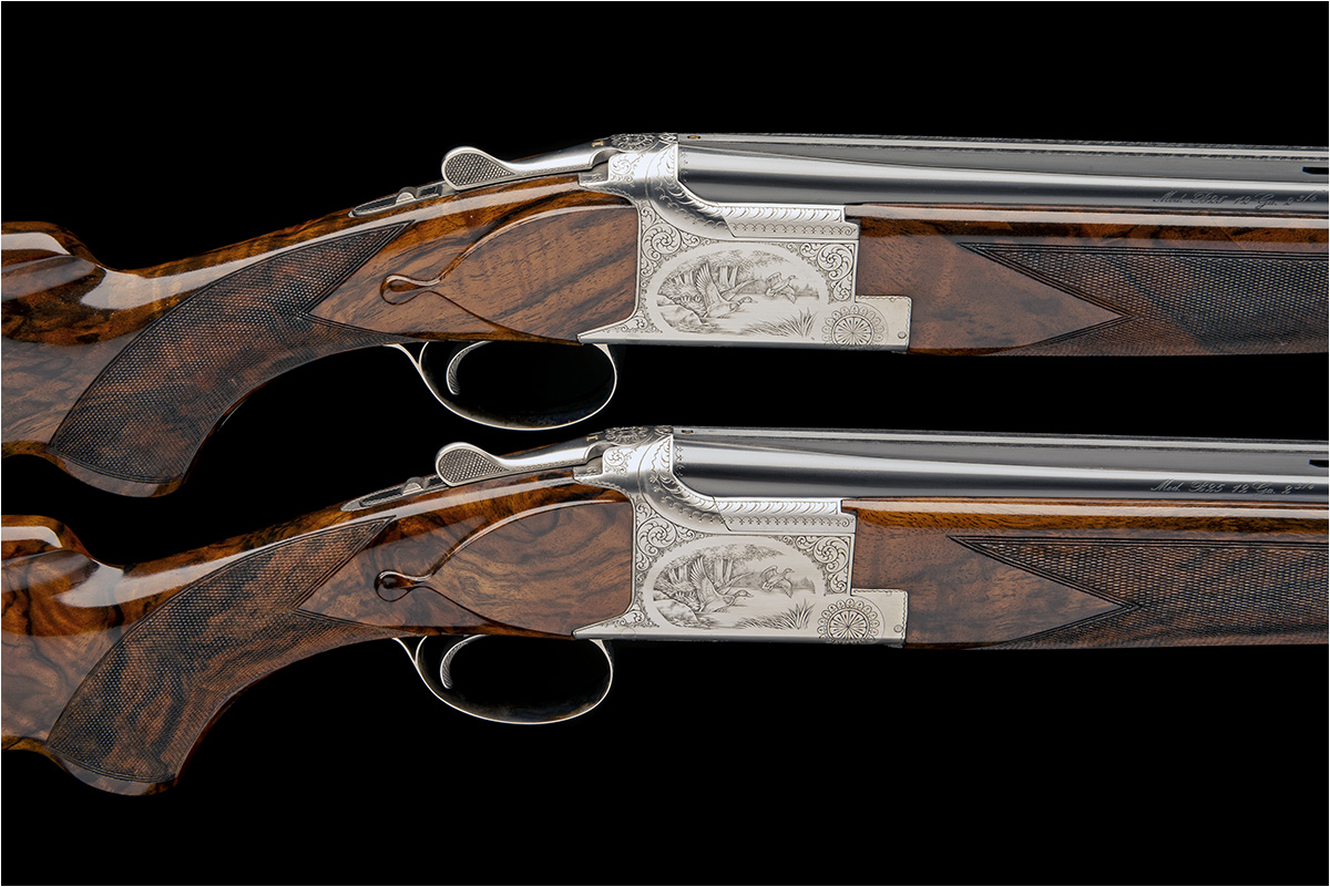 28in. nitro barrels with 12mm ventilated matt top-ribs gold-inlaid 'I' and 'II' and the top tubes engraved 'BROWNING ARMS COMPANY. MORGAN. UTAH & MONTREAL P.Q. MADE IN BELGIUM BY BROWNING. and 'MOD. B25 12 GA. 2 3/4"', 2 3/4in. chambers, bored approx. true and imp. cyl. (both), hold-open toplevers gold-inlaid 'I' and 'II', manual safeties with integral barrel selector switches with gold-inlaid 'O', 'U' and 'S' details, acanthus scroll engraving surrounding game scenes of pheasant and duck, signed 'D. MATAGNE', bright finish, 14 1/2in. highly-figured pistolgrip stocks including buttplates, weight 7lb. 8oz. (both), together with their original Browning Custom shop cardboard cartons