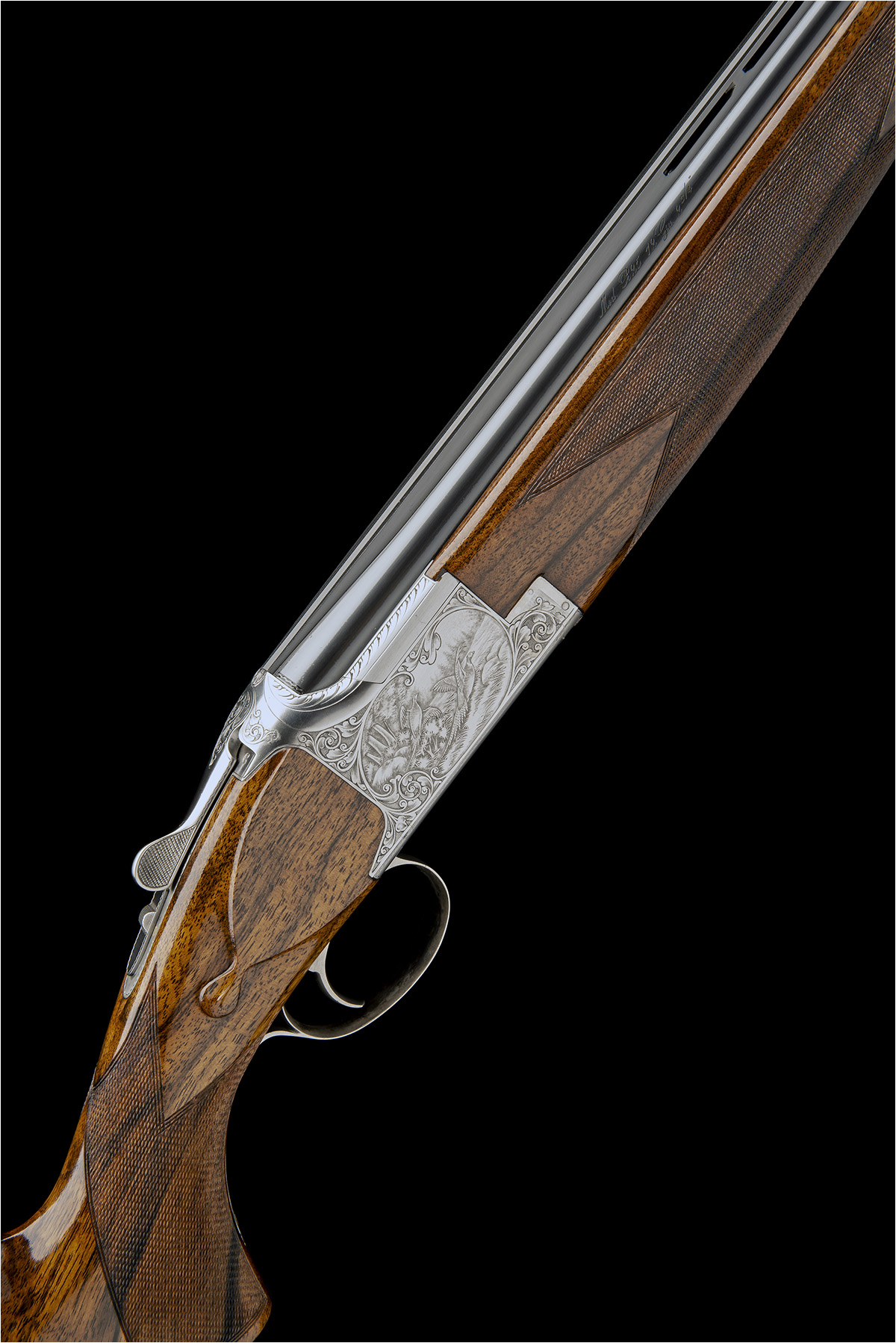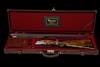 28in. nitro barrels with 12mm ventilated matt top-rib, the top tube engraved 'BROWNING ARMS COMPANY. MORGAN. UTAH & MONTREAL P.Q. MADE IN BELGIUM BY BROWNING. and 'MOD. B25 12 GA. 2 3/4"', 2 3/4in. chambers, bored approx. imp. cyl. in both, hold-open toplever, manual safety with gold-inlaid 'O', 'U' and 'S' detail, bold acanthus scroll bordering surrounding game scenes of mallard and pheasant, the underside with a lone partridge, signed 'J.P. BAILLY', bright finish, 14 1/2in. pistolgrip stock including buttplate, weight 7lb. 10oz, in its lightweight leather case together with its original Browning Custom shop cardboard carton