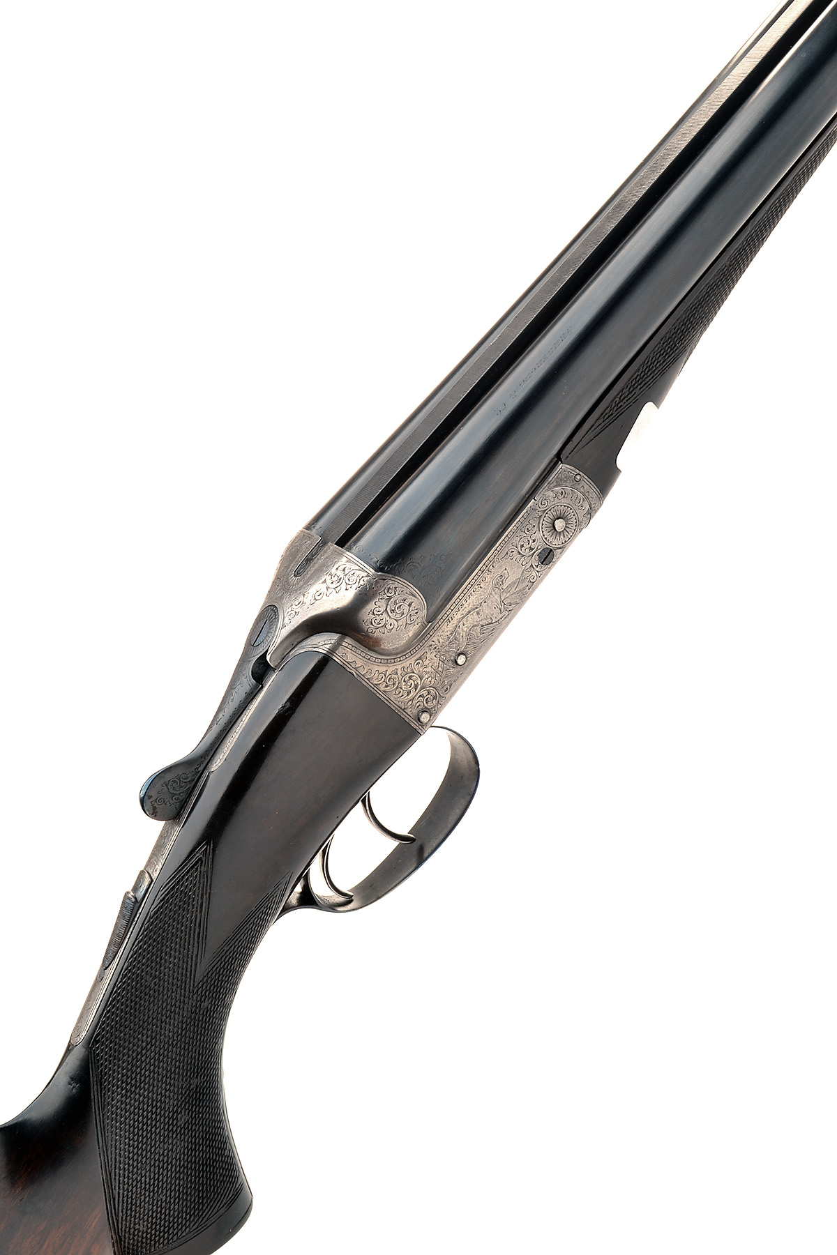 ARMSTRONG & CO. 12-BORE (3IN.) BOXLOCK EJECTOR WILDFOWLING GUN, serial no. 42374, 29 1/2in. nitro reproved barrels with broad raised file cut rib, 3in. chambers, bored approx. 1/2 and full choke, large treble-grip action with side-clips, automatic safety, beaded border and acanthus scroll engraving surrounding scenes of pointers on point, the triggerguard with a duck in flight, brushed and reblued finish, 15in. pistolgrip stock with pistolgrip-cap and including 7/8in. buttplate, sling eyes, weight 7lb. 10oz.