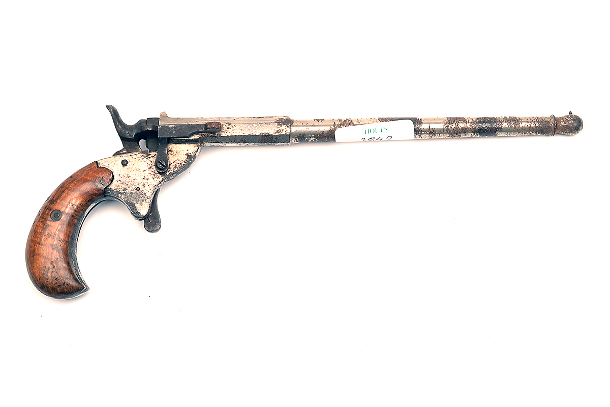 A 6mm RIMFIRE GALLERY-PISTOL, UNSIGNED, serial no. 4, German circa 1875, with octagonal to round 9 3/4in. barrel, bulbous muzzle, hammer on pin flobert action, spur trigger and walnut birdshead grips, fair amount of nickel-plated finish remaining, not recommended for use