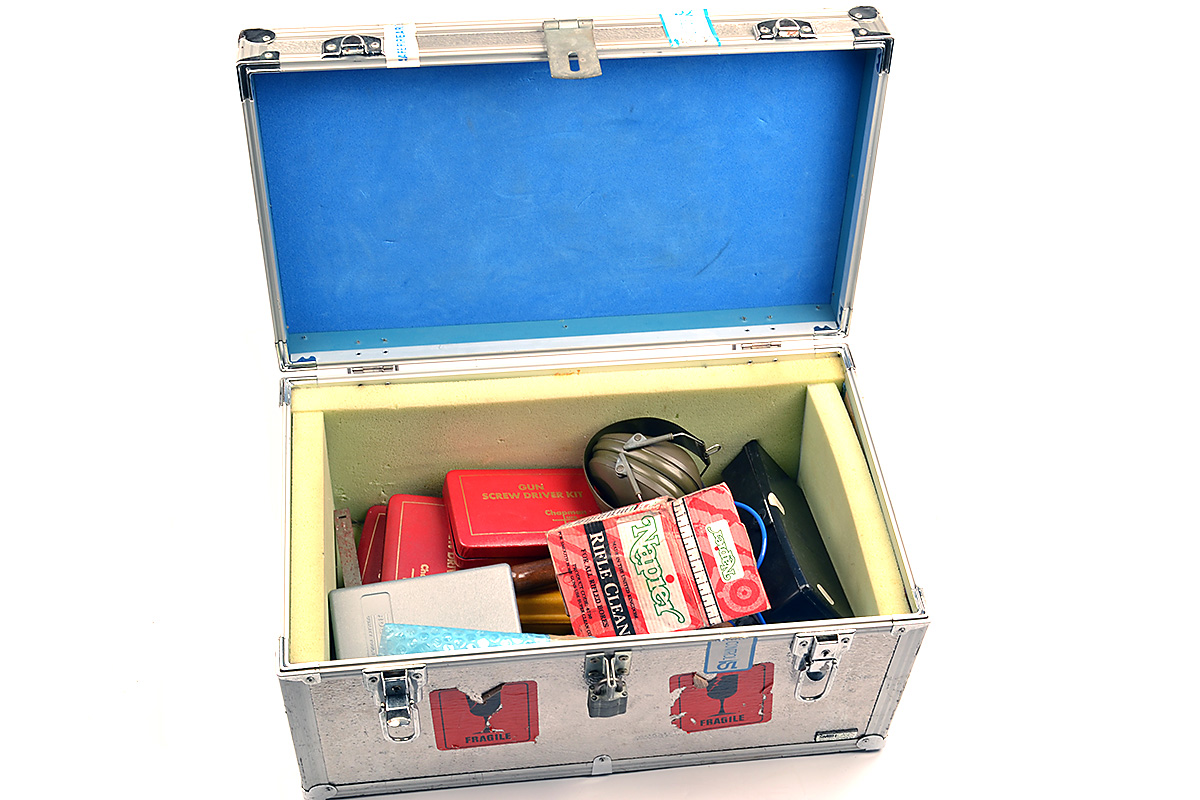 A COLLECTION OF SHOOTING RELATED ITEMS, comprising of an aluminum foam-lined box, ear defenders, scope rail, pad lock, de-capper, 3 x sets of 'GUN SCREW DRIVER KIT', calipers, pistol cleaning brushes, files