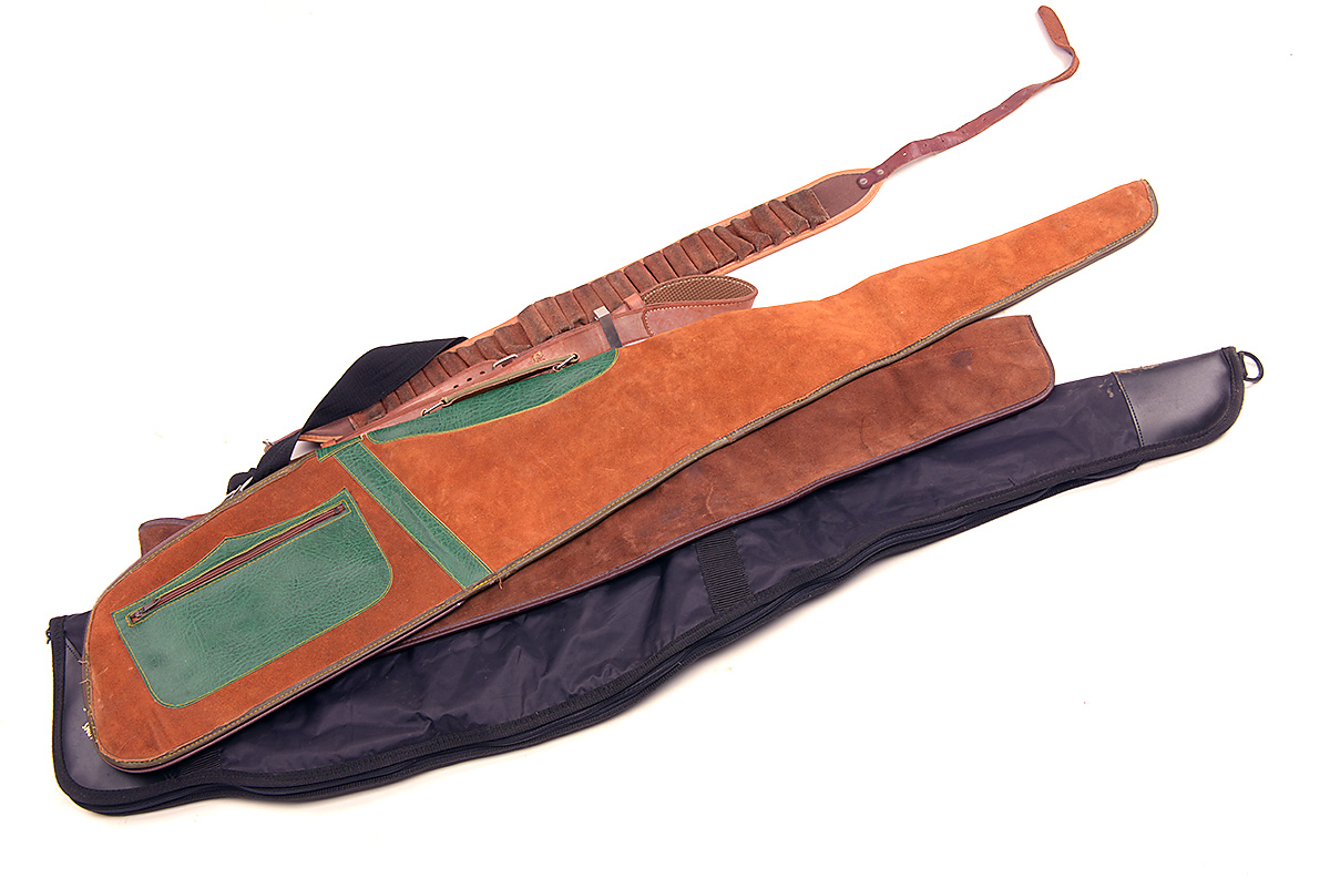 A SMALL COLLECTION OF SHOOTING RELATED ITEMS, comprising of 3 x single gunslips, a target sling, 12-bore cartridge belt