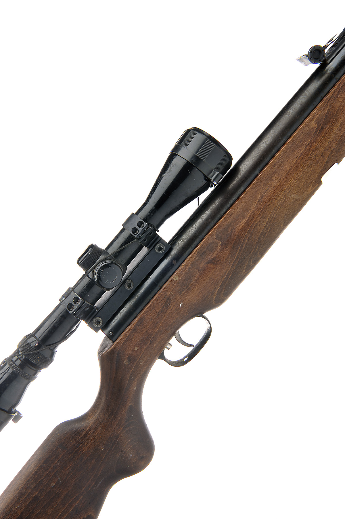 A .22 BREAK-BARREL AIR-RIFLE SIGNED WEIHRAUCH, MODEL 'HW35STD', serial no. 1054839, with 19in. barrel including sound-moderator, lockin breech, plain air-chamber, beech half-stock, fitted with an unsigned 3-9x40 telescopic sight and a leather sling