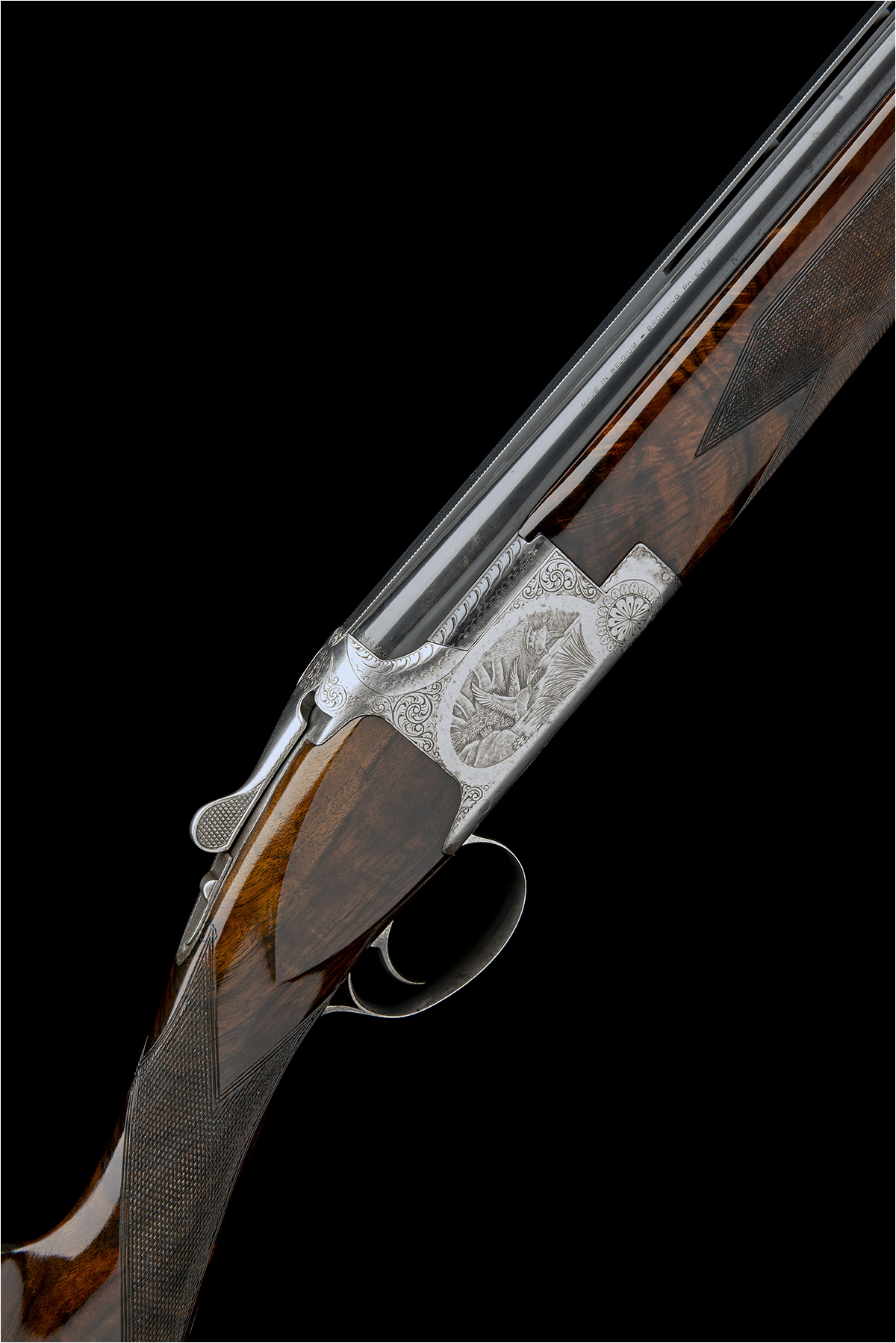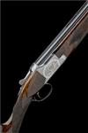 27 1/2in. nitro barrels with 5mm ventilated matt top-rib, 2 3/4in. chambers, bored approx. 1/4 and 1/2 choke, hold-open toplever, manual safety with integral barrel selector switch with gold-inlaid 'O', 'U', and 'S' detail, acanthus scroll engraving surrounding scenes of fowl and pheasant taking flight, brushed finish (some wear and spots of rust), 14 1/4in. figured roachbelly stock including buttplate (some knots with filled repair), weight 7lb. 1oz.