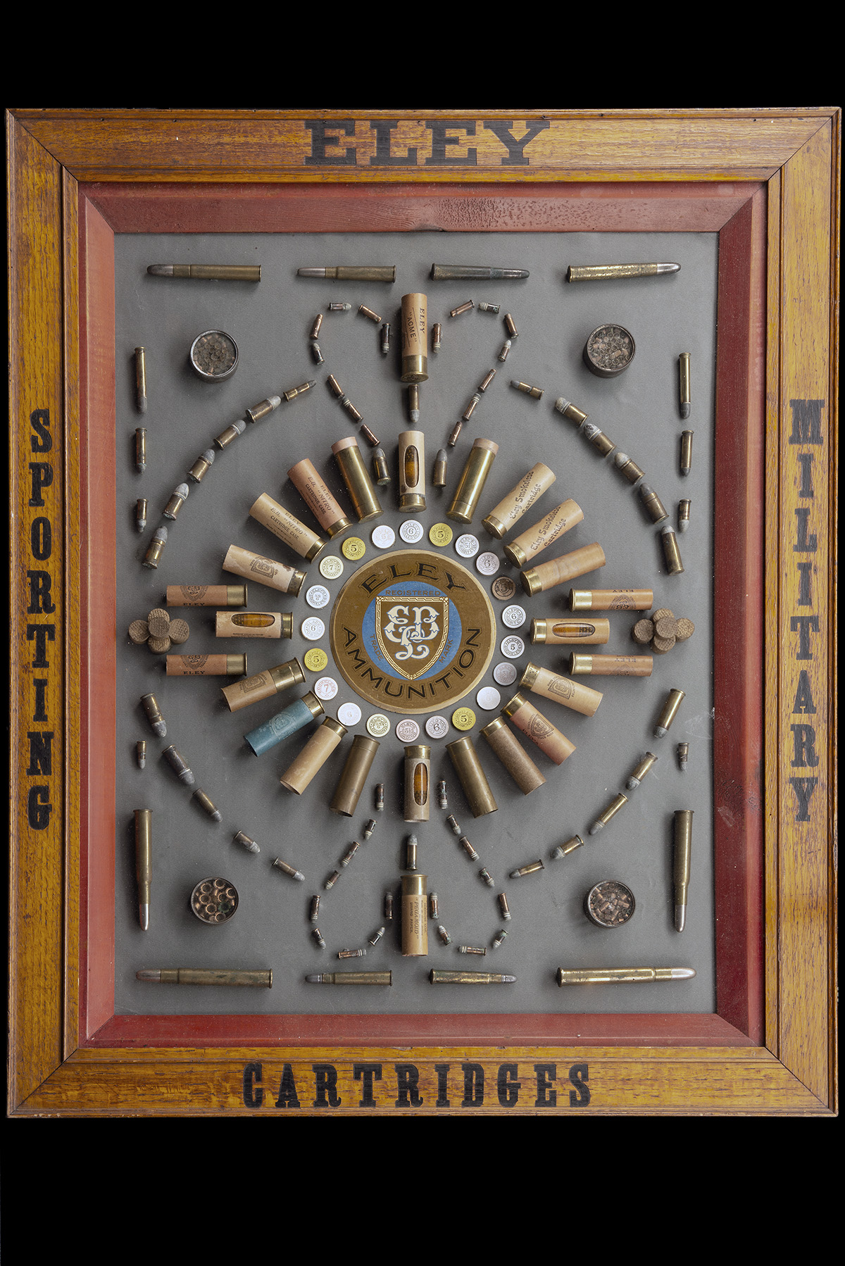 displaying various sporting and military cartridges in a circular pattern, ranging from .360 to 12-bore and 16-bore paper and brass cases, oak glazed frame marked 'ELEY', 'SPORTING', 'MILITARY', 'CARTRIDGES'