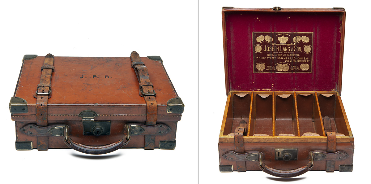 JOSEPH LANG & SON A BRASS-CORNERED OAK AND LEATHER CARTRIDGE MAGAZINE,