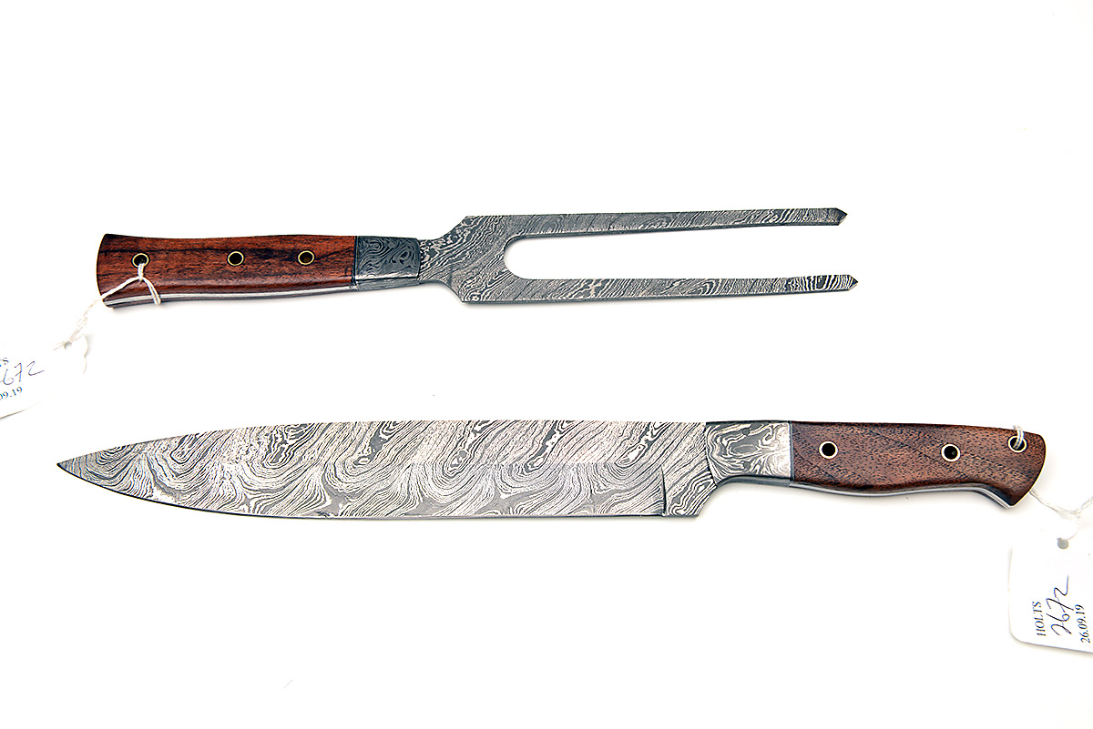 A SET OF UNUSED DAMASCUS STEEL AND WALNUT CARVING KNIFE AND FORK,