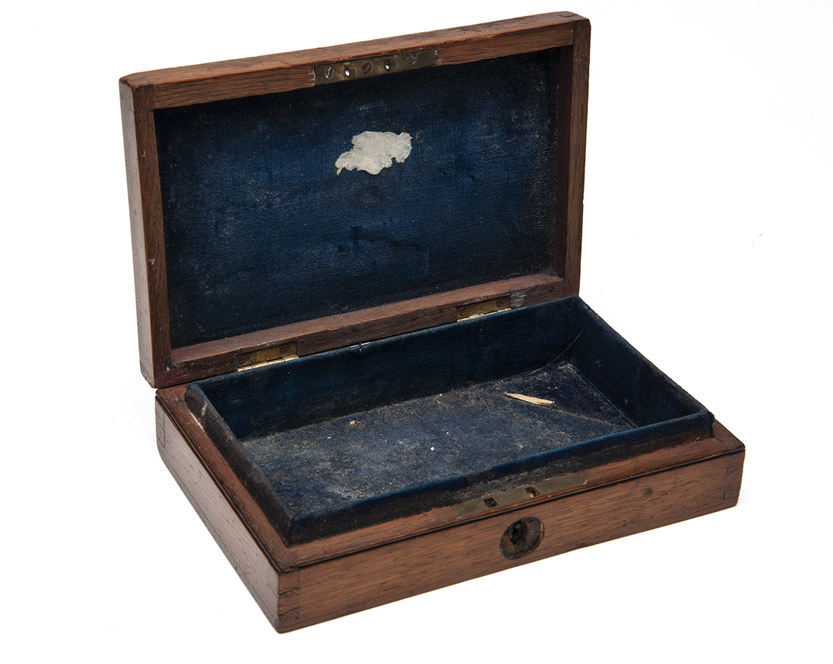 remnants of baize lining remaining, compartments removed, measuring externally 7 1/4in. x 4 1/2in. x 1 3/4in., lock escutcheon and key missing