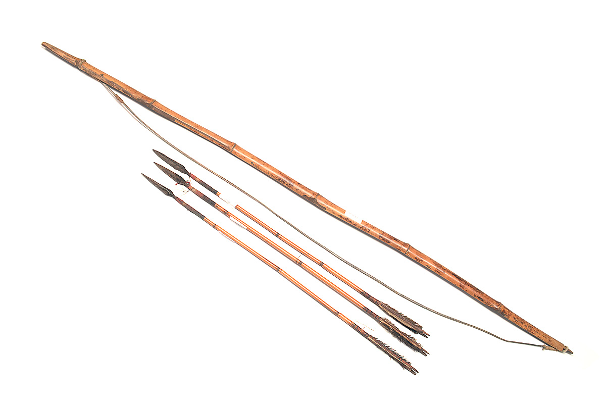 A VINTAGE BAMBOO LONGBOW TOGETHER WITH THREE PERIOD ARROWS, probably Central African, the bow approximately 60in. overall with rawhide string, the cane arrows with iron tips and feather flights (not for use) (4)