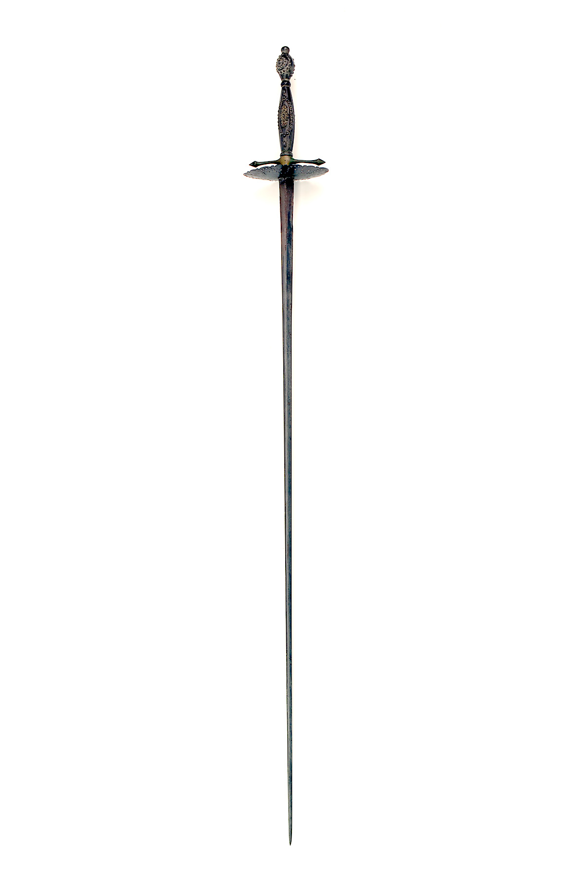 A CUT-STEEL COURT or SMALL-SWORD, probably English and mid nineteenth century, with hollow sided triangular 33in. blade, dished oval guard with cut steel decoration, straight inner guard and faceted hilt with urn pommel, no scabbard