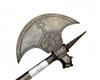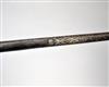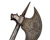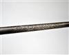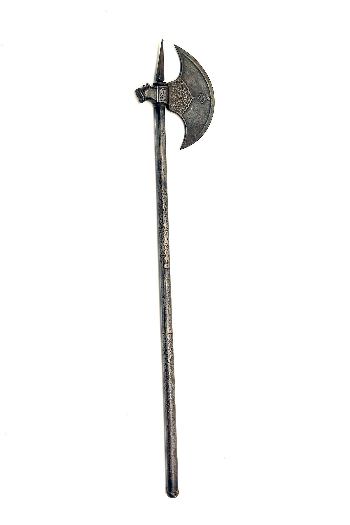 AN INDO-PERSIAN ALL STEEL AXE, circa 1850, with 31in. shaft etched with two panels of decoration and terminating in a spike, carved crescent head thickened around the edges and with a stylised cow's head to reverse
