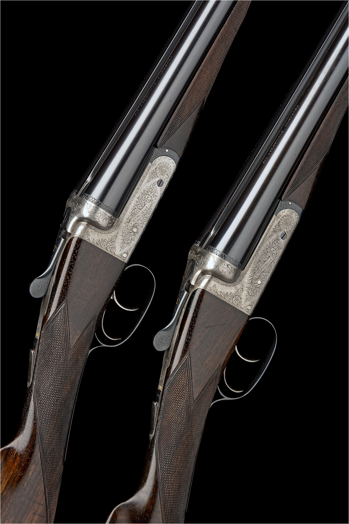 25in. nitro barrels with matt Churchill-ribs, gold-inlaid 'XXV' and '1' and '2' at the breech ends, the tubes engraved 'CHURCHILL (GUNMAKERS) LTD. ORANGE ST. GUNWORKS. LEICESTER SQUARE. LONDON.', 2 1/2in. chambers, bored approx. 1/4 and 1/2 choke, toplevers gold-inlaid '1' and '2', automatic safeties with gold-inlaid 'SAFE' details, border and acanthus scroll engraving, brushed and blued finish, 15 1/2in. stocks (swept at combs) including 1 3/8in. wooden extensions, weight 6lb. 4oz., in their canvas motor case