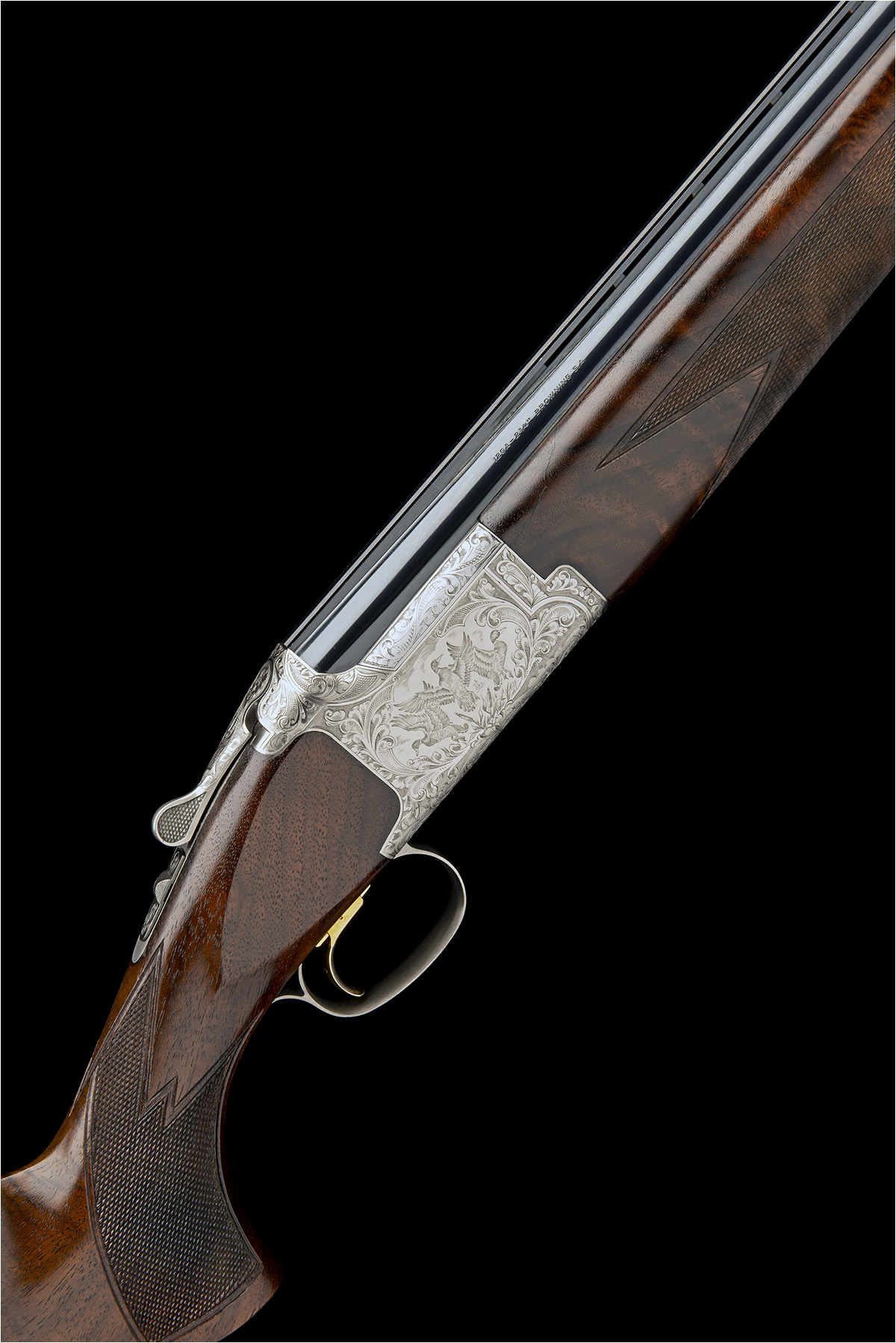 32in. nitro reproved barrels with 10mm ventilated matt top-rib, intermediate bead sight, 2 3/4in. chambers, multichokes (no spares), hold-open toplever, manual safety with integral barrel selector switch, adjustable gold-washed trigger, game and scroll engraving, bright finish, 14 3/4in. figured pistolgrip stock including 5/8in. rubber recoil pad, weight 8lb. 1oz., in a Browning universal case