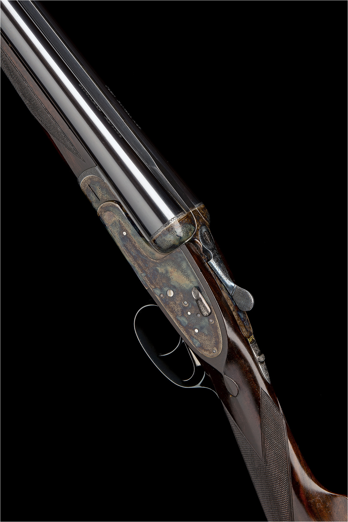 26 1/8in. nitro reproved chopperlump barrels with Churchill style rib, the tubes engraved 'JOHN POWELL AGT. GUNMAKER, REIGATE.', 2 3/4in. chambers, bored approx. 1/4 choke in both, treble-grip rounded-bar action with Holland & Holland style self-opening system and hidden third-bite, removable striker discs, automatic safety with gold-inlaid 'SAFE' detail, hand-detachable lockplates, gold-inlaid cocking-indicators, articulated front trigger, rolled-edge triggerguard, border, acanthus scroll and floral bouquet engraving, retaining virtually full colour-hardening and finish, 14 1/2in. figured stock, weight 6lb. 11oz., in a universal case