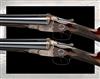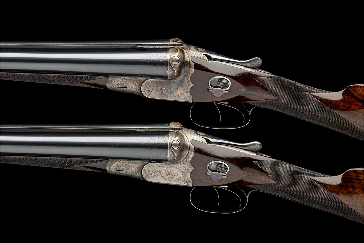 25in. sleeved nitro barrels with matt Churchill-ribs, 2 1/2in. chambers, bored approx. true cyl. and 1/4 choke (No.1) and 1/2 and full choke (No.2), scroll-back treble-grip actions with carved serpentine fences, incorporating Greener 'self-acting ejector' patent ejector system, patent no. 2003 of 9th May 1881, use numbers 1377 and 1378, action flats and fore-end irons engraved '1' and '2', minor fractures at bridges, 1873 patent crossbolts, hold-open toplever with 'Jumping Jack' return studs, automatic side safeties with gold-inlaid arrow and 'SAFE' details, fine floral bouquet and acanthus scroll engraving, the undersides with small vignettes of game birds, retaining traces of renewed colour-hardening and finish, 14 3/8in. boldly-figured stocks with horn insert drop points and buttplates, weight 6lb. 6oz. (No.1) and 6lb. 9oz. (No.2)