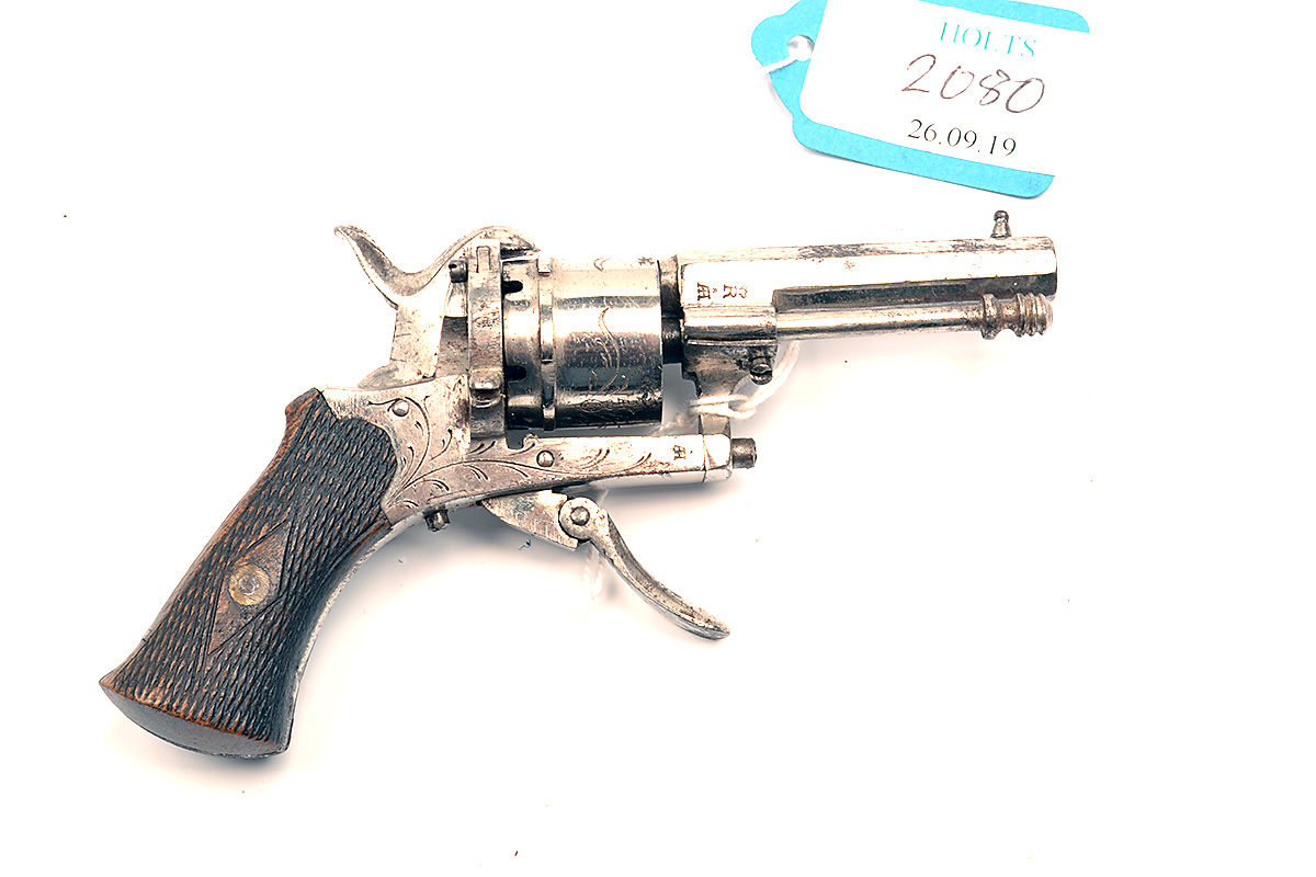 A 6mm PINFIRE PURSE-REVOLVER, UNSIGNED, no visible serial number, Belgian circa 1870, with nickel-plated octagonal 2in. barrel, engraved open frame and cylinder, chequered walnut grips and folding trigger, much finish remaining, return spring weak