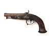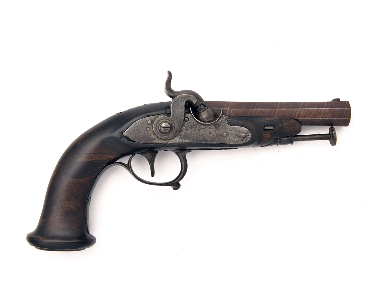 A 32-BORE PERCUSSION OVERCOAT PISTOL, UNSIGNED, no visible serial number, circa 1800 with later conversion to percussion, twist iron swamped scratch-rifled 4 1/2in. barrel, plain lock with vestiges of pan, walnut half-stock (repaired at wrist), guarded trigger and iron ramrod