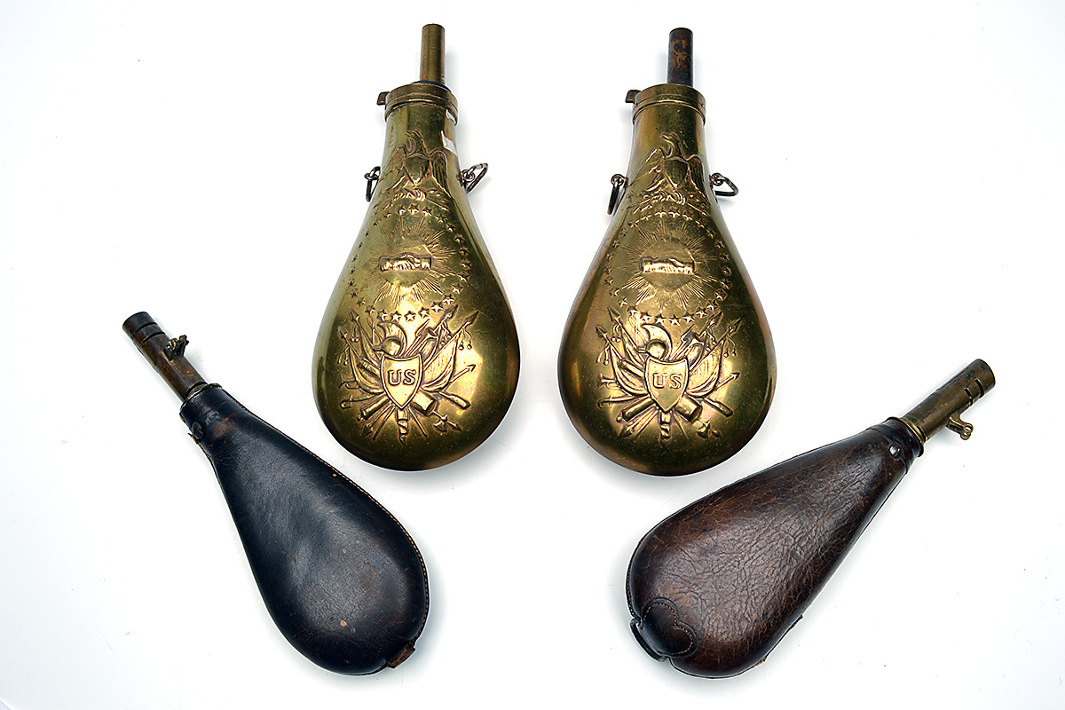 FOUR POWDER AND SHOT-FLASKS including two large reproduction martial flasks nd two period leather shot flasks, the last both with their levers detached but present