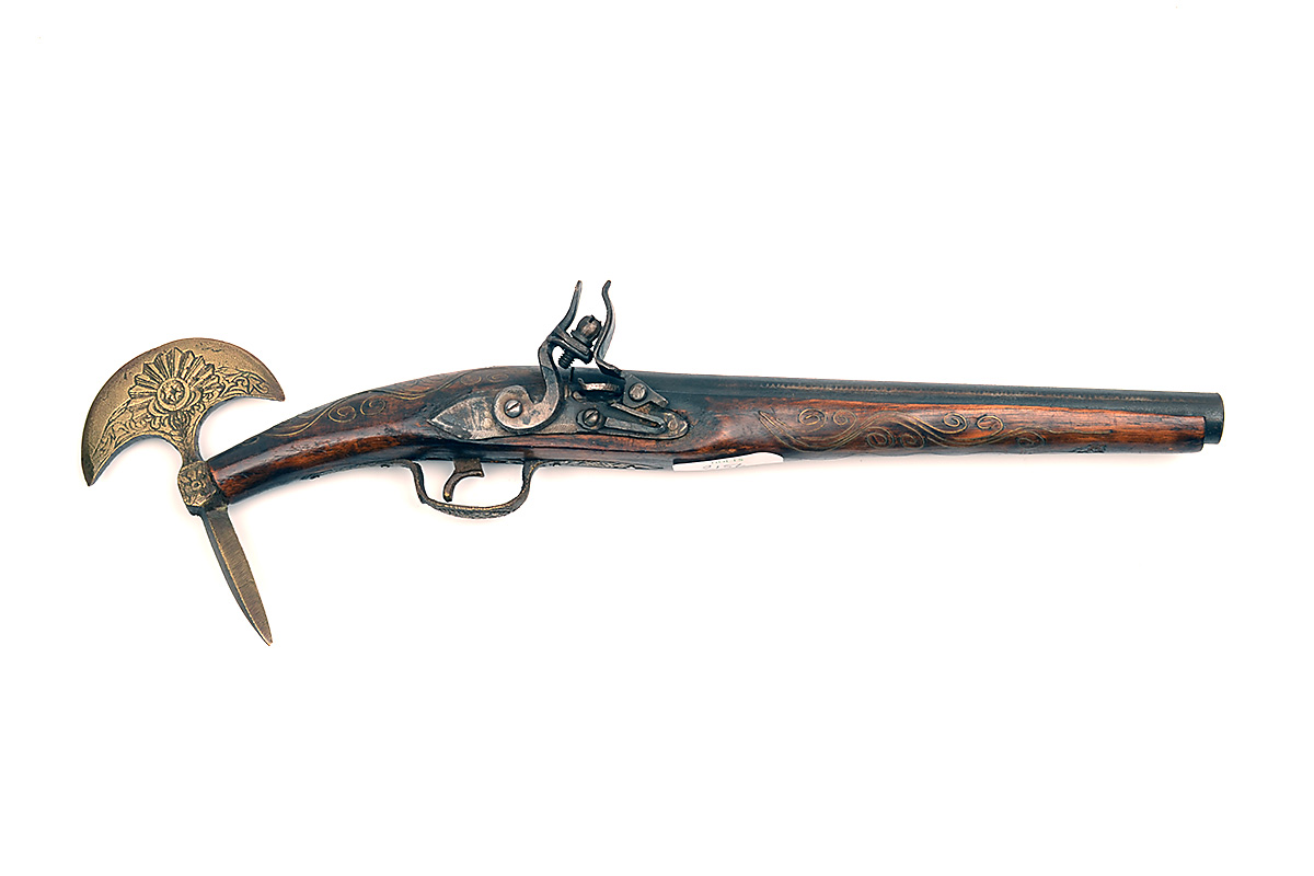 A DECORATIVE INERT FLINTLOCK AXE-PISTOL, probably Indian or North African, with 10 1/2in. barrel, the wood full-stock terminating in an axe-head at butt