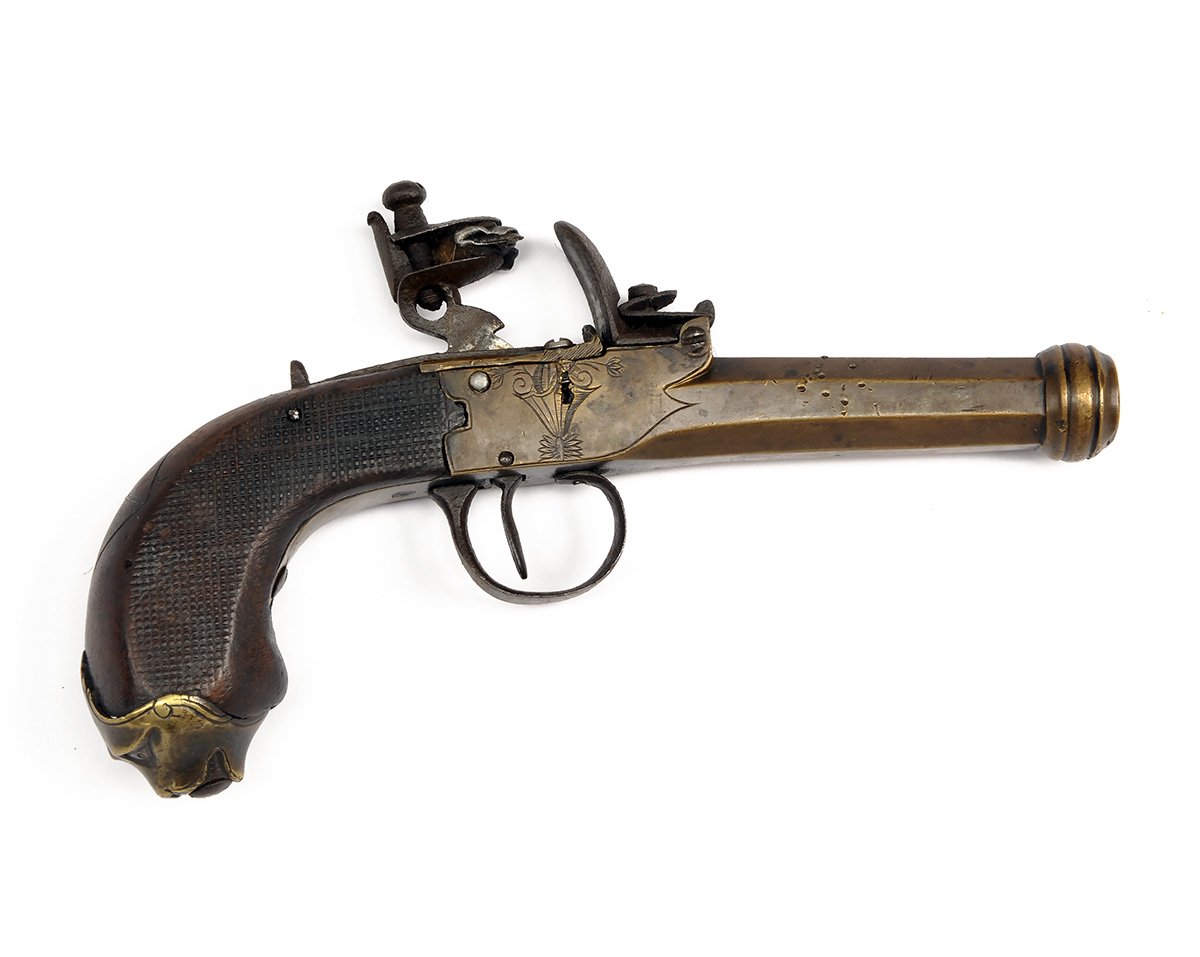 A 54-BORE FLINTLOCK ALL-BRASS POCKET-PISTOL, UNSIGNED, no visible serial number, Belgian circa 1800, with octagonal 3in. barrel, banded muzzle, central hammer and guarded trigger and chequered walnut slab-sided butt with grotesque mask cap