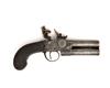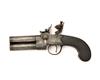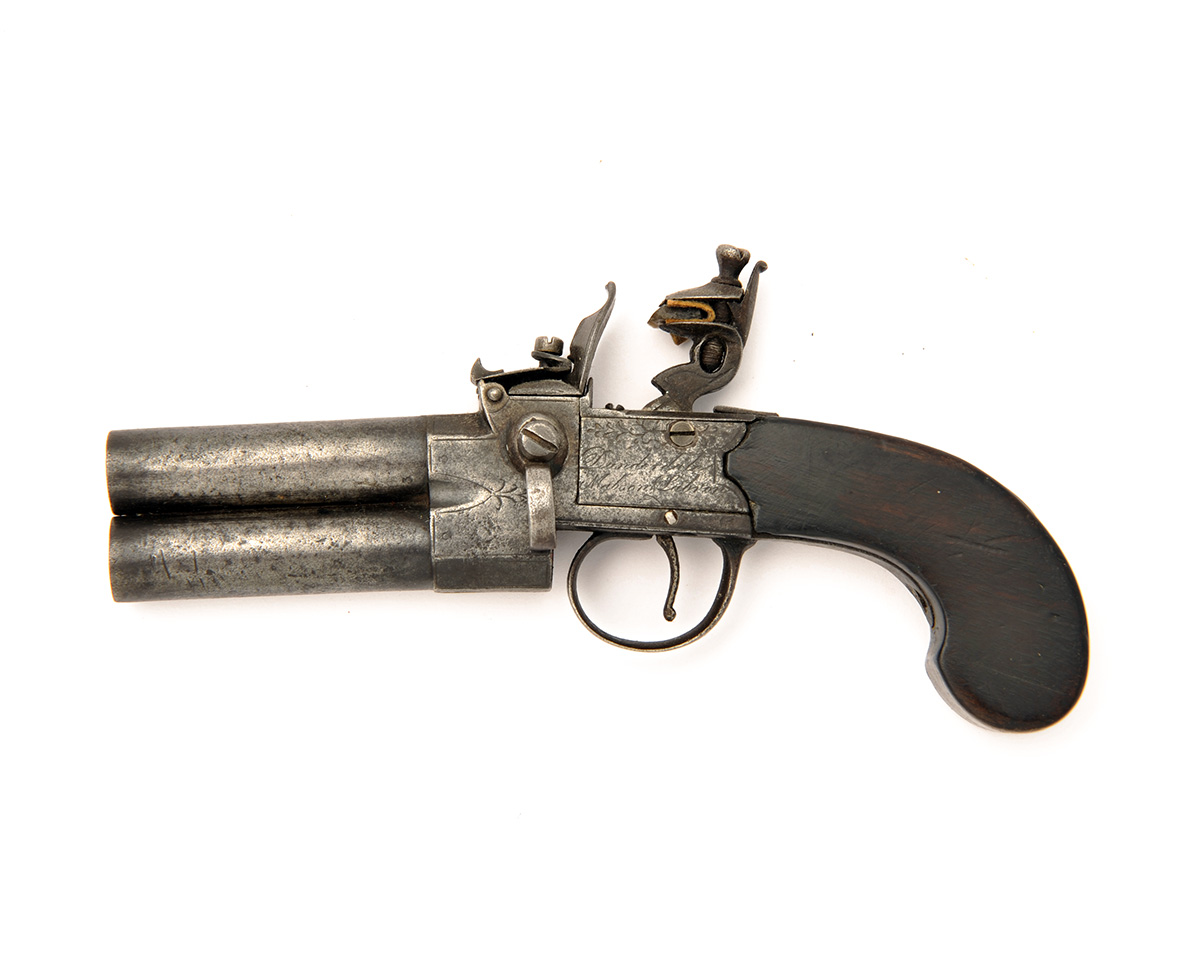 A 40-BORE FLINTLOCK TAP-ACTION OVER-UNDER PISTOL SIGNED DUNDERDALE MABSON & LABRON, no visible serial number,