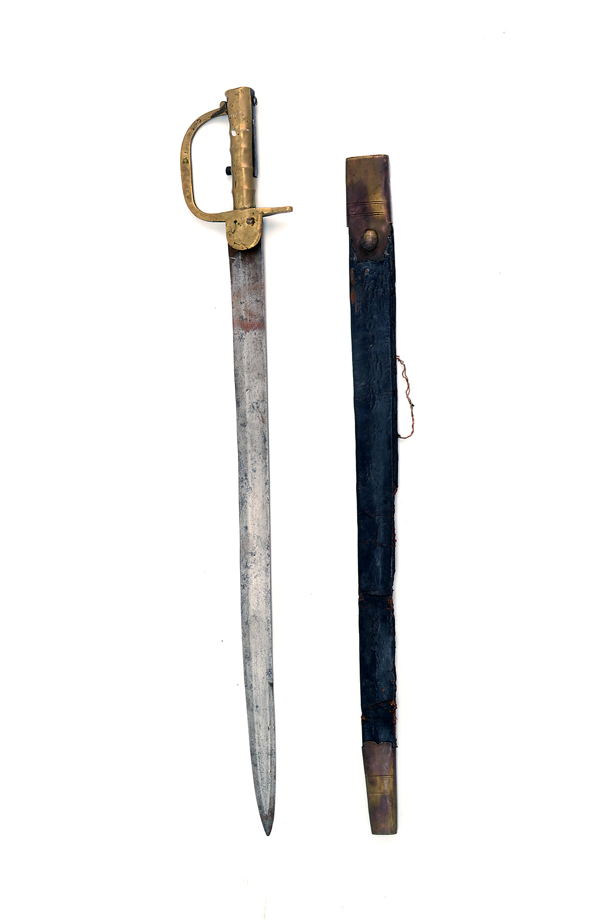 A PERIOD INDIAN ISSUE BAKER RIFLE BAYONET, with ribbed brass hilt, complete with scabbard (scabbard poor)