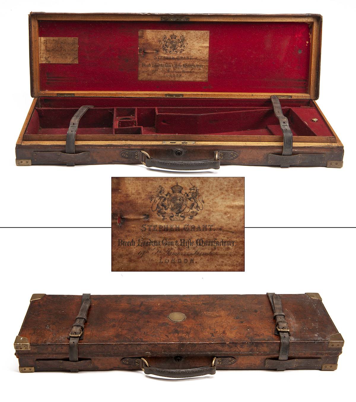 fitted for 30in. barrels, the interior lined with red baize, a paper Stephen Grant trade label, central brass push-button lock (key missing), the lid exterior with a blank brass escutcheon