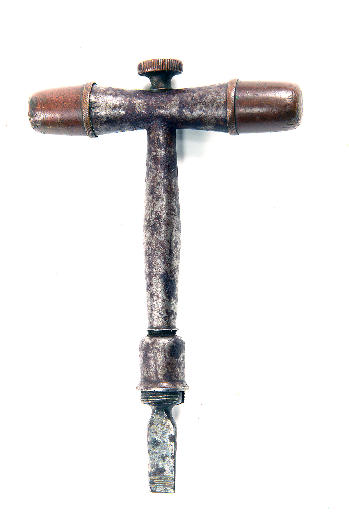 A COMBINATION NIPPLE-WRENCH TOOL 'T' shaped with central pricker, provision for storing two spare nipples with removable dome caps, detachable turnscrew head (missing retaining cap)