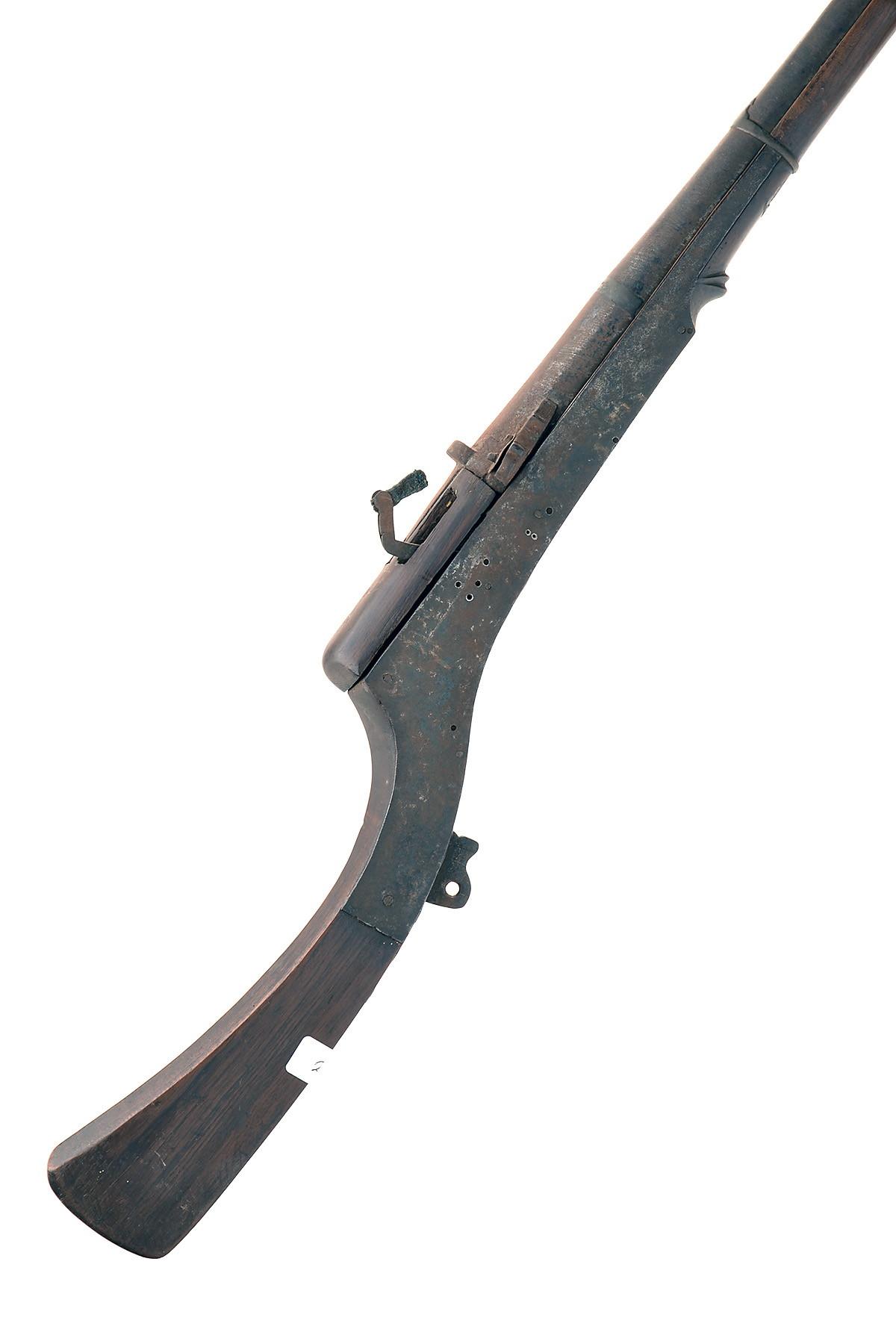 AN INDO-PAKISTANI 16-BORE MATCHLOCK CAMEL-GUN, circa 1860, with 36 1/2in. barrel, faceted bulbous muzzle and swollen breech, walnut three-quarter stock with Sind-style butt, sheet iron plating to action sides, hatchet trigger and three narrow barrel-bands
