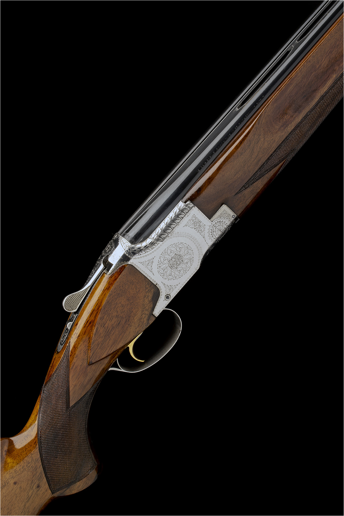 30in. nitro barrels with 12mm ventilated matt rib with intermediate bead sight, 2 3/4in. chambers, bored approx. 3/4 choke in both, hold-open toplever, manual safety with integral barrel-selector switch, gold-washed trigger, floral and scroll engraving, bright finish, 14in. pistolgrip stock including 1in. ventilated rubber recoil pad, weight 7lb. 11oz.