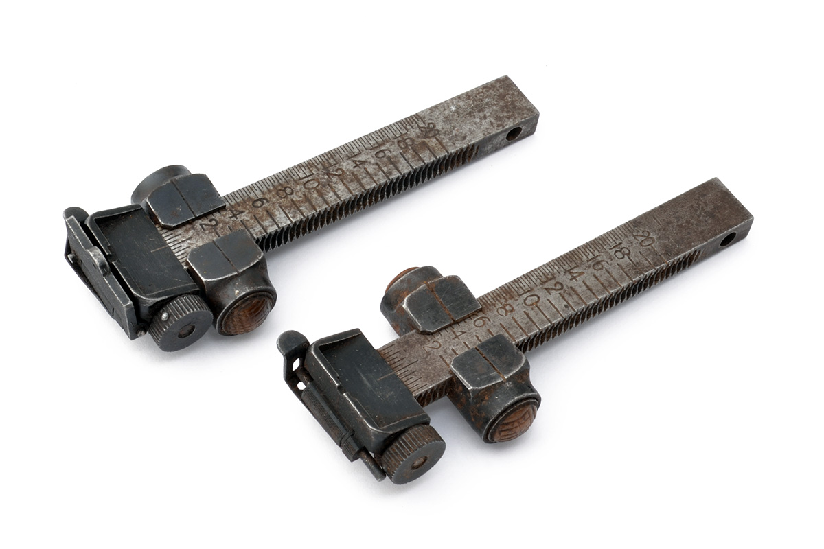 TWO SCARCE ENFIELD NO1MKI PATTERN REAR-SIGHTS risers only (no mount), one fitted with flip-down aperture (absent on second), both windage adjustable and with chequered horn push-buttons for the sliders (2)