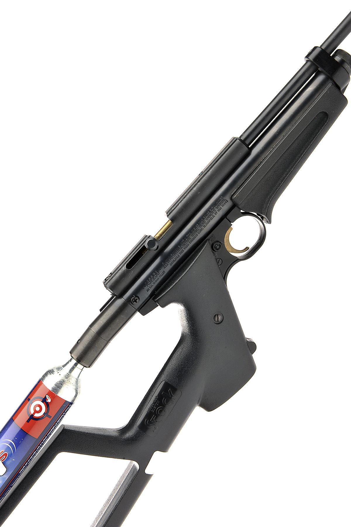 A .177 CO2-POWERED AIR-RIFLE SIGNED CROSMAN, MODEL 'AS2250', serial no. 805B13520,, with unsighted 20 1/2in. barrel including sound moderator, bolt action receiver, black abs plastic skeleton butt-stock and fore-end, rer-mounted 'Air Source' bottle, untested